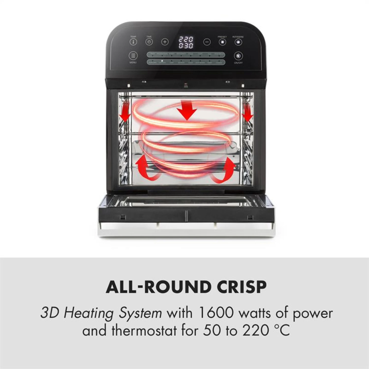 Il segreto della Friggitrice Klarstein Aero Vital Cube è il sistema di riscaldamento 3D, che frigge, cuoce, griglia o arrostisce con 1600 watt e fa circolare aria calda. Il calore viene distribuito in modo rapido e ottimale grazie all’elemento riscaldante in acciaio inox sulla parte superiore e alla ventola di ricircolo dell’aria sul retro, mentre il cibo viene cotto delicatamente e rapidamente su tutti i lati, e non è necessario scongelarlo. L’AeroVital Cube funziona con l’Easy Start: uno dei 16 programmi può essere selezionato tramite il pannello touch e la temperatura e il tempo di cottura sono preimpostati direttamente per il piatto desiderato. Basta premere Start e la friggitrice farà il suo lavoro. Naturalmente è possibile anche programmare manualmente la temperatura e il tempo di funzionamento. La temperatura può essere impostata in fasi di 10°C da 50 a 220 °C e il tempo di cottura in fasi che variano da 1 minuto sino a 60 minuti. C’è una possibilità di scelta tra 13 differenti pietanze come patatine fritte, pizza, torta, pesce, verdure o pollo e 3 funzioni per scongelare, tenere in caldo e asciugare.