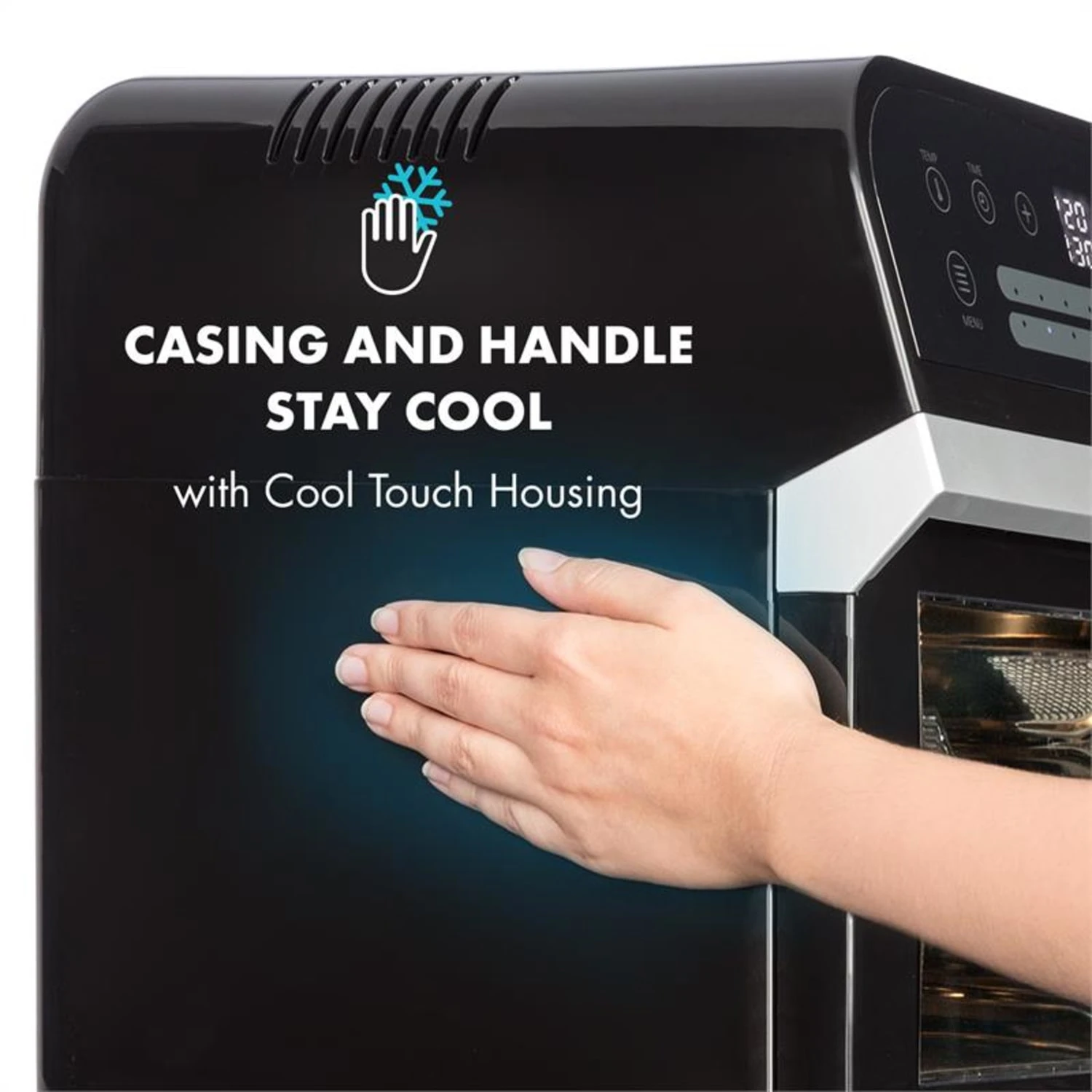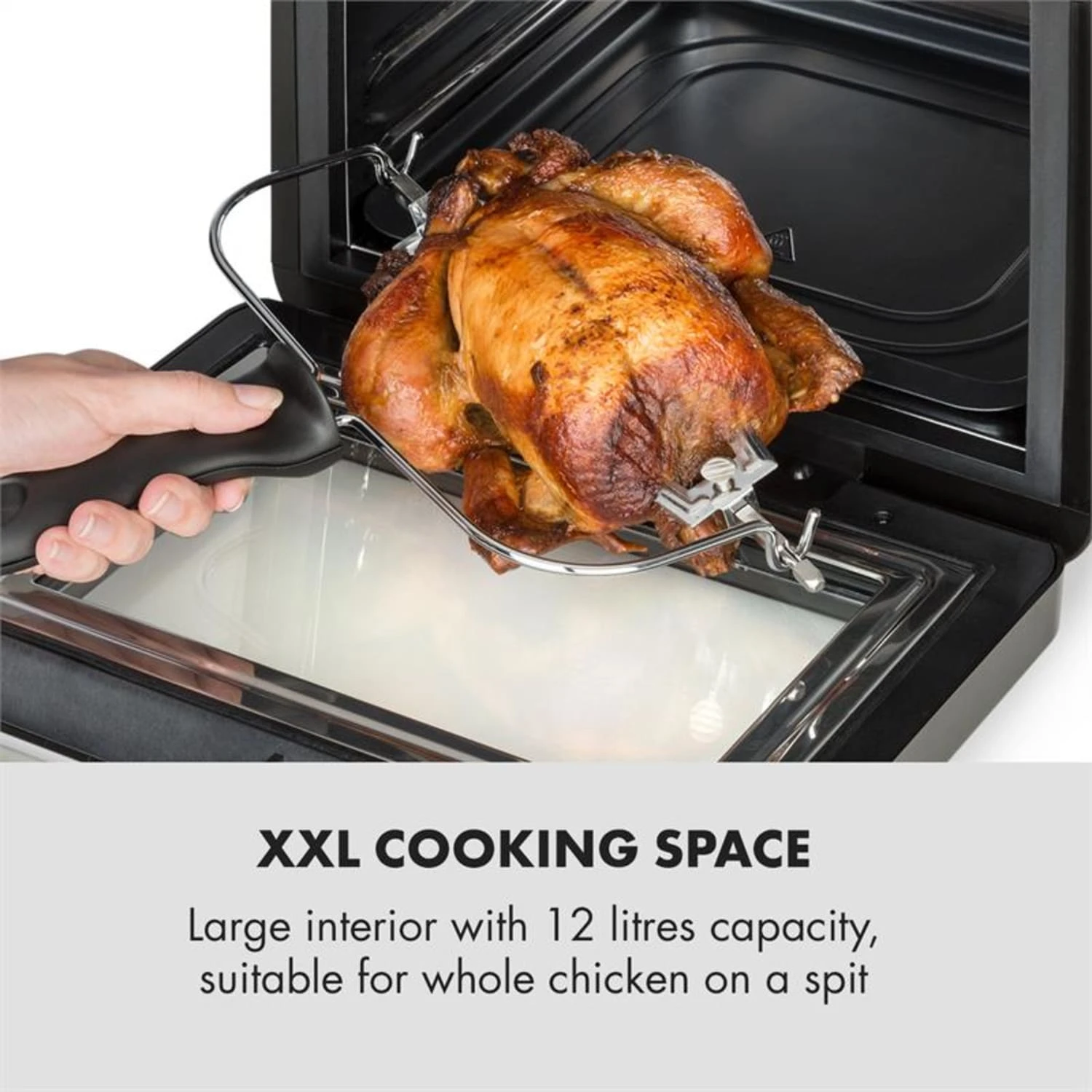 L’ampio interno XXL con la sua enorme capacità di 12 litri non lascia nulla a desiderare e può contenere anche un pollo intero alla griglia. Grazie al design del mini forno, la friggitrice ad aria calda Klarstein AeroVital Cube è particolarmente compatta e occupa lo stesso spazio sulla credenza di una friggitrice tradizionale! Il vasto set di accessori è equipaggiato in modo ottimale per tutti gli scopi: una vaschetta per la raccolta del grasso in uscita, una griglia e un cestino per cibi fritti di grandi e piccole dimensioni come le ali di pollo o le crocchette e uno spiedino da rosticceria con relativo sollevatore rotante a spiedo. La grande novità è la possibilità di friggere a proprio piacimento senza doversi preoccupare delle calorie, perché tutto viene cucinato con aria calda senza aggiungere olio.