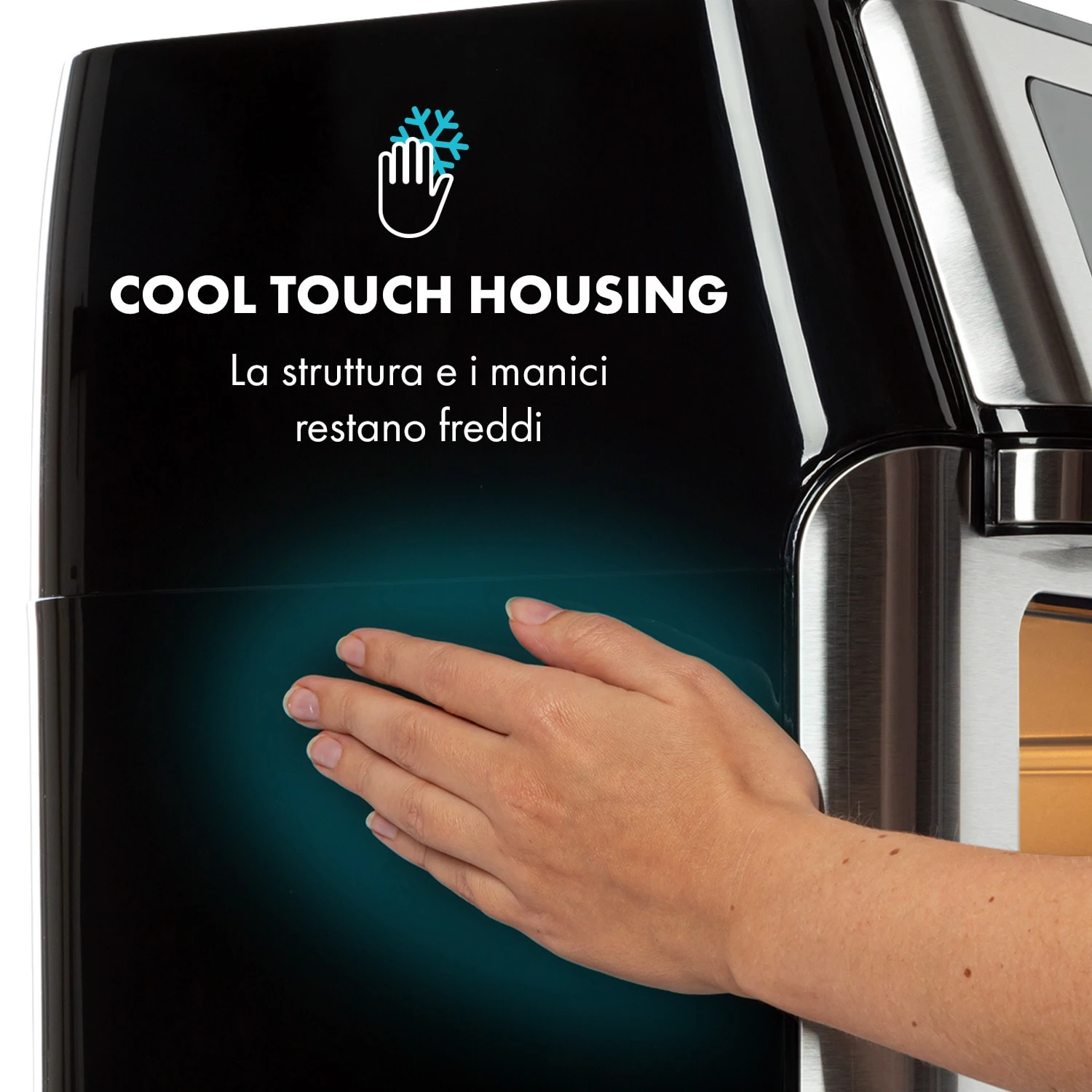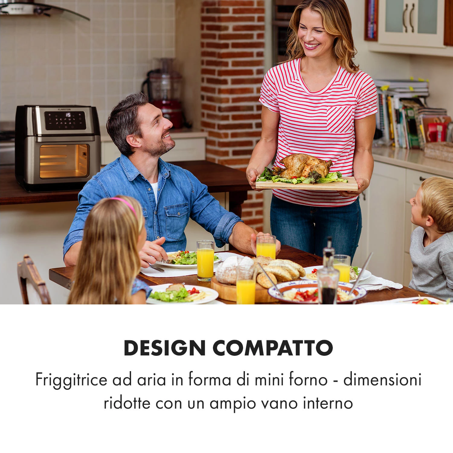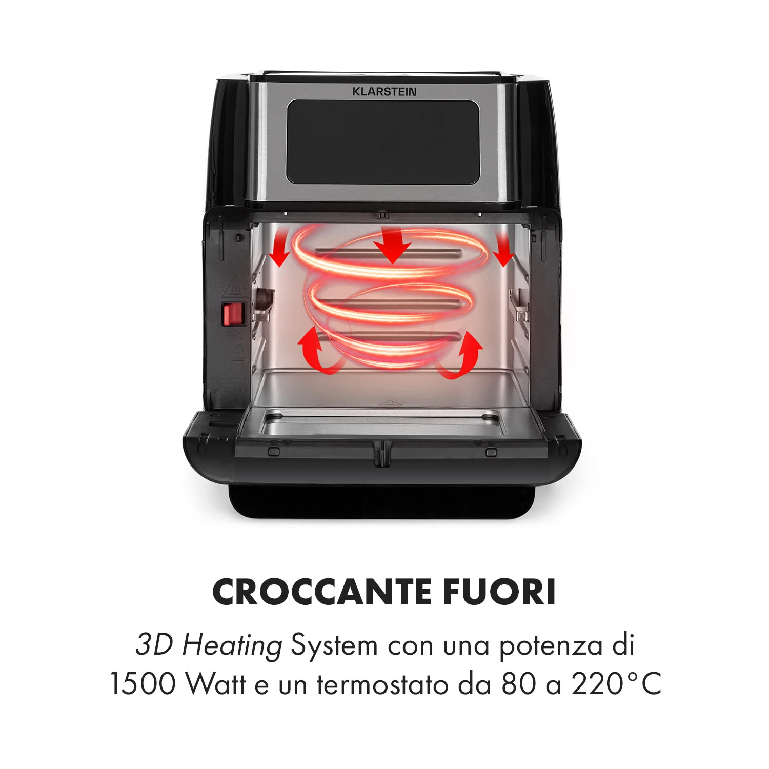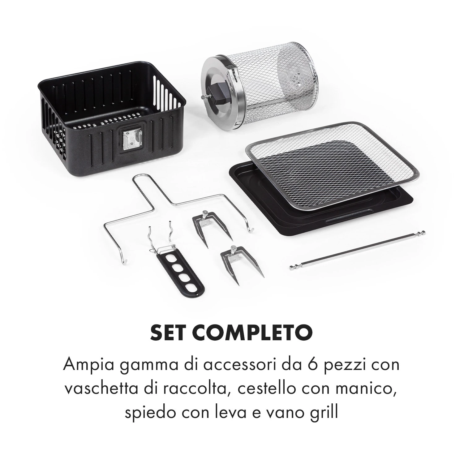 Il segreto della friggitrice AeroVital Fry di Klarstein è il 3D Heating System, che le permette di friggere, cuocere come in forno, grigliare o arrostire con 1500 Watt di potenza e la circolazione di aria calda. Il calore viene distribuito perfettamente grazie all’elemento riscaldante in acciaio inox in alto e alla ventola sul retro, in modo da cuocere in modo omogeneo e rapidissimo, senza bisogno di scongelare. Anche il controllo è facilissimo: AeroVital Fry offre 9 programmi, selezionabili con pannello touch. Tra i programmi disponibili si trovano patatine fritte, pesce, pizza, essiccare & disidratare, pollo intero (girarrosto), pollo, bistecca e cottura al forno. Temperatura e durata possono essere anche impostate manualmente: tra 80 e 220 °C in intervalli di 5 °C e fino a 60 minuti in intervalli di 1 minuto. Il grande vano interno XL con 10 litri di capacità soddisfa tutte le necessità delle diverse preparazioni e permette addirittura la cottura di un pollo intero. La friggitrice ad aria AeroVital Fry di Klarstein, grazie al design ispirato a un mini forno, è particolarmente compatta e non necessita di maggiore spazio per il posizionamento rispetto a una tradizionale friggitrice. Il set di accessori è ideale per ogni tipo d’uso: una piccola vaschetta di gocciolamento per raccogliere il grasso in uscita, un cesto per friggere alimenti grandi e piccoli, come alette di pollo o crocchette, un girarrosto con relativo sollevatore e una gabbia per grigliare 3D a 360°, in cui le patatine diventeranno croccantissime su tutti i lati grazie alla rotazione costante. Il meglio: potrete friggere come e quando volete, senza preoccuparvi delle calorie, dato che tutto viene cotto con aria calda e completamente senza aggiungere olio.