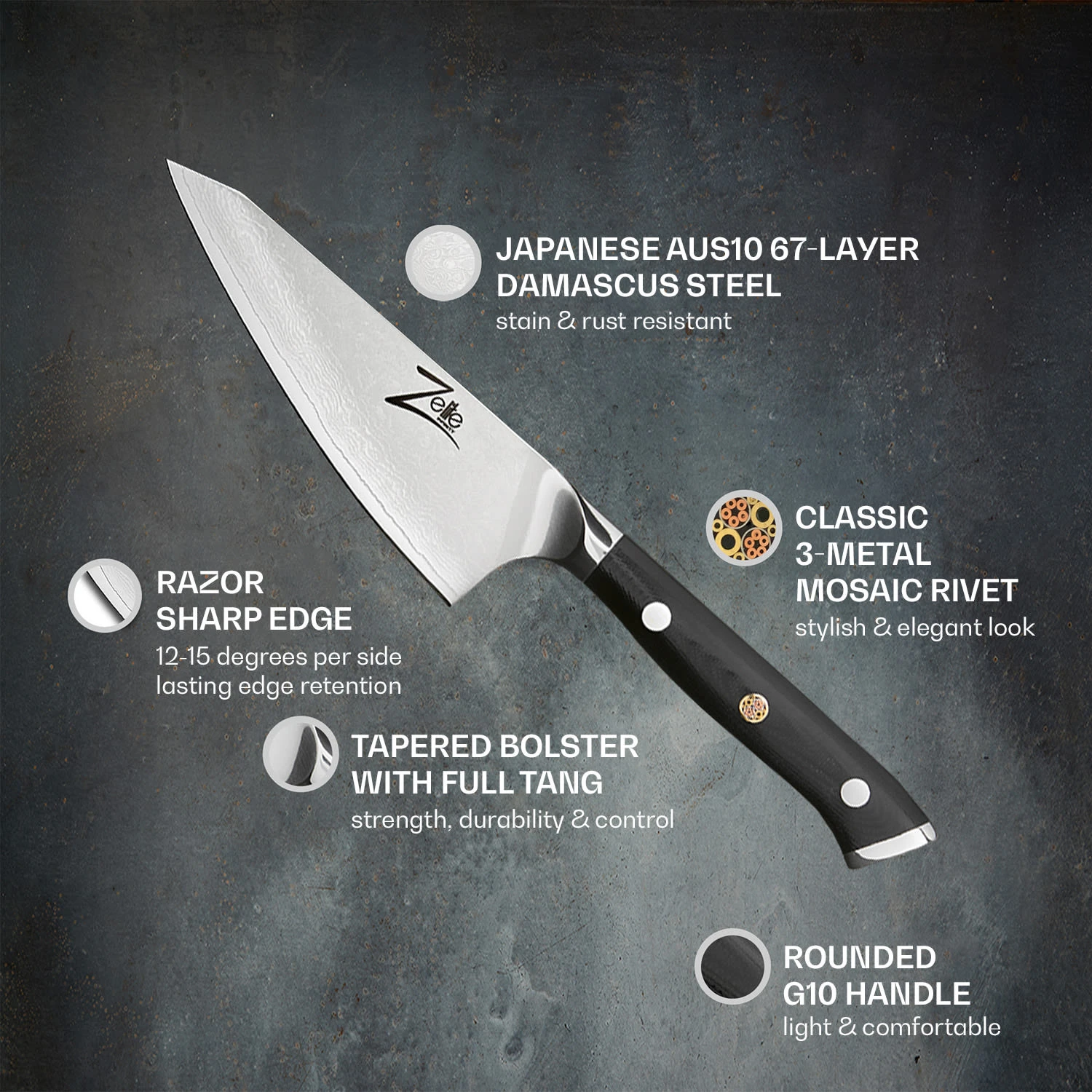 Esclusivi coltelli di precisione in stile giapponese: la serie di coltelli affilati a mano Alpha-Royal Japanese di Zelite Infinity by Klarstein soddisfa standard elevati per ogni arte culinaria. Un totale di 67 strati sovrapposti vanno a formare la lama cangiante in acciaio damascato giapponese di alta qualità. La struttura perfettamente bilanciata ed ergonomica e l’impeccabile impugnatura in fibra di vetro G10 con triplo rivetto permettono di maneggiare al meglio questi elegantissimi utensili da cucina. Qui, affilatura, durevolezza, peso, controllo e maneggevolezza si combinano con un design eccezionale, perfezionato da un rivetto ornato a mosaico in 3 metalli sull’impugnatura.