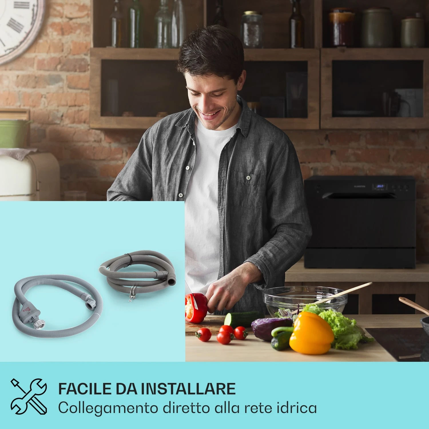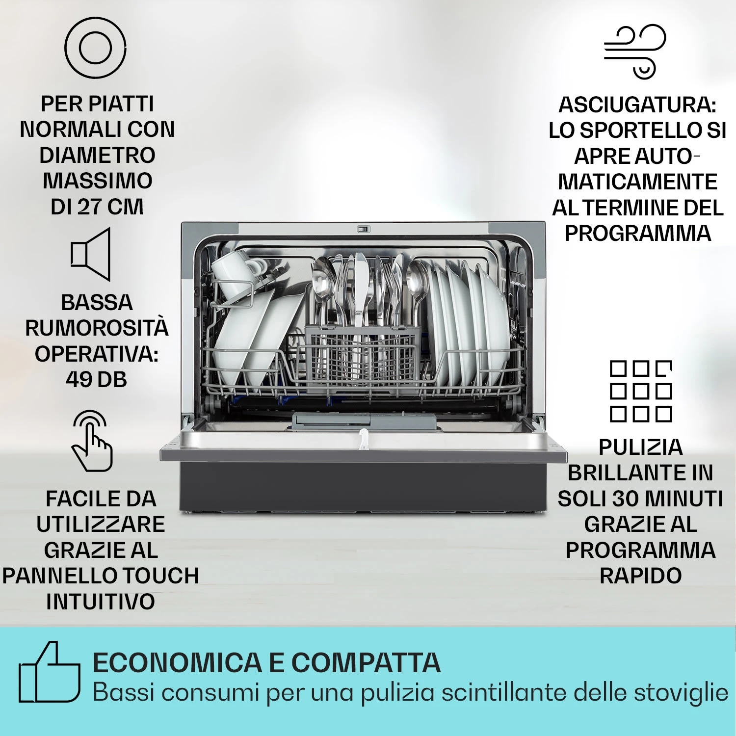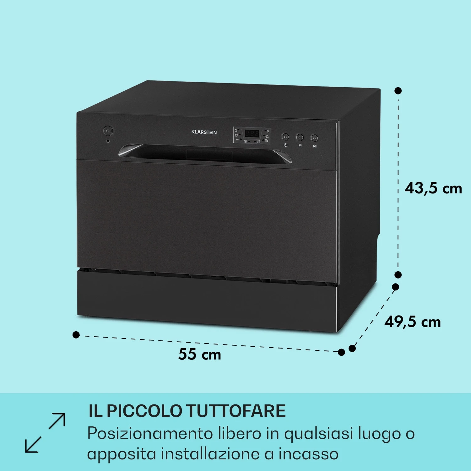 La lavastoviglie Amazonia 6 di Klarstein è il nuovo aiutante dall’aspetto speciale nella tua casa! C’è spazio per un massimo di 6 coperti all’interno. Con 1380 Watt di potenza e sei programmi diversi, Amazonia 6 si occupa dei piatti sporchi. Tutti i programmi possono essere impostati rapidamente e facilmente tramite il chiaro pannello di controllo con tre pulsanti. Un supporto incorporato facilita anche la pulizia dei bicchieri da vino o da champagne. L’Amazonia 6 può essere utilizzata come dispositivo da incasso o lavastoviglie da tavolo.