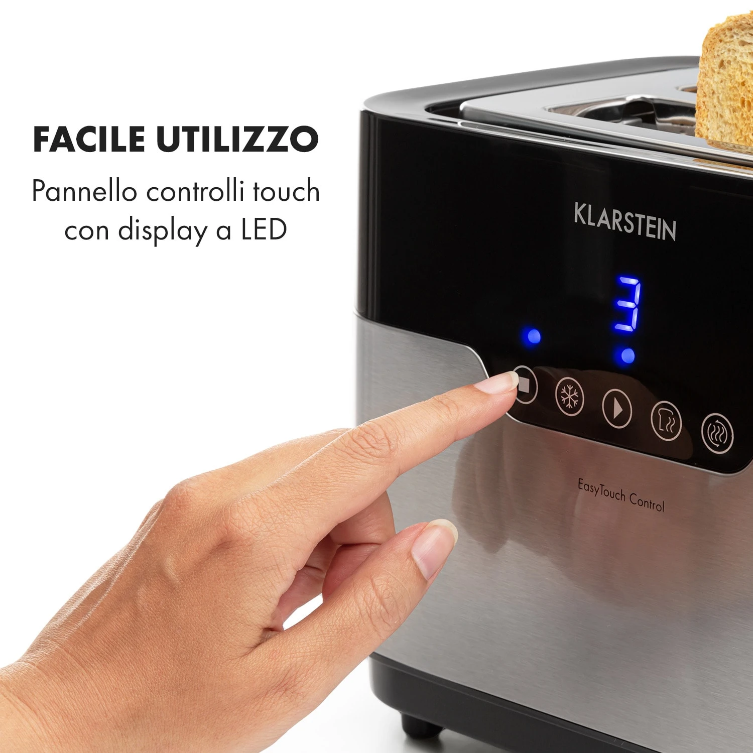 Grazie ai suoi potenti 920 Watt, i toast e altri tipi di pane vengono tostati in un battibaleno e sono pronti per essere consumati. L’utilizzo è facilissimo: basta inserire le fette di pane nel tostapane e selezionare il livello di doratura e la funzione sul pannello touch. Il display a LED indica chiaramente la funzione selezionata. Le griglie di metallo flessibili si adattano allo spessore del pane e lo dirigono delicatamente verso il basso. Oltre ai sette livelli di doratura il tostapane offre anche una funzione di scongelamento, riscaldamento e interruzione. Per cuocere i panini è disponibile un rialzo, posizionabile all’occorrenza sul tostapane.