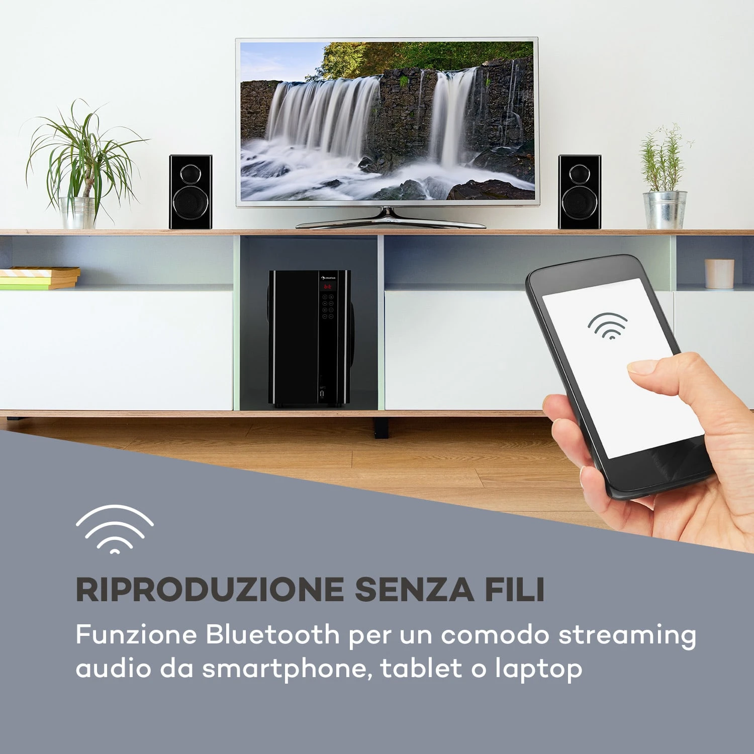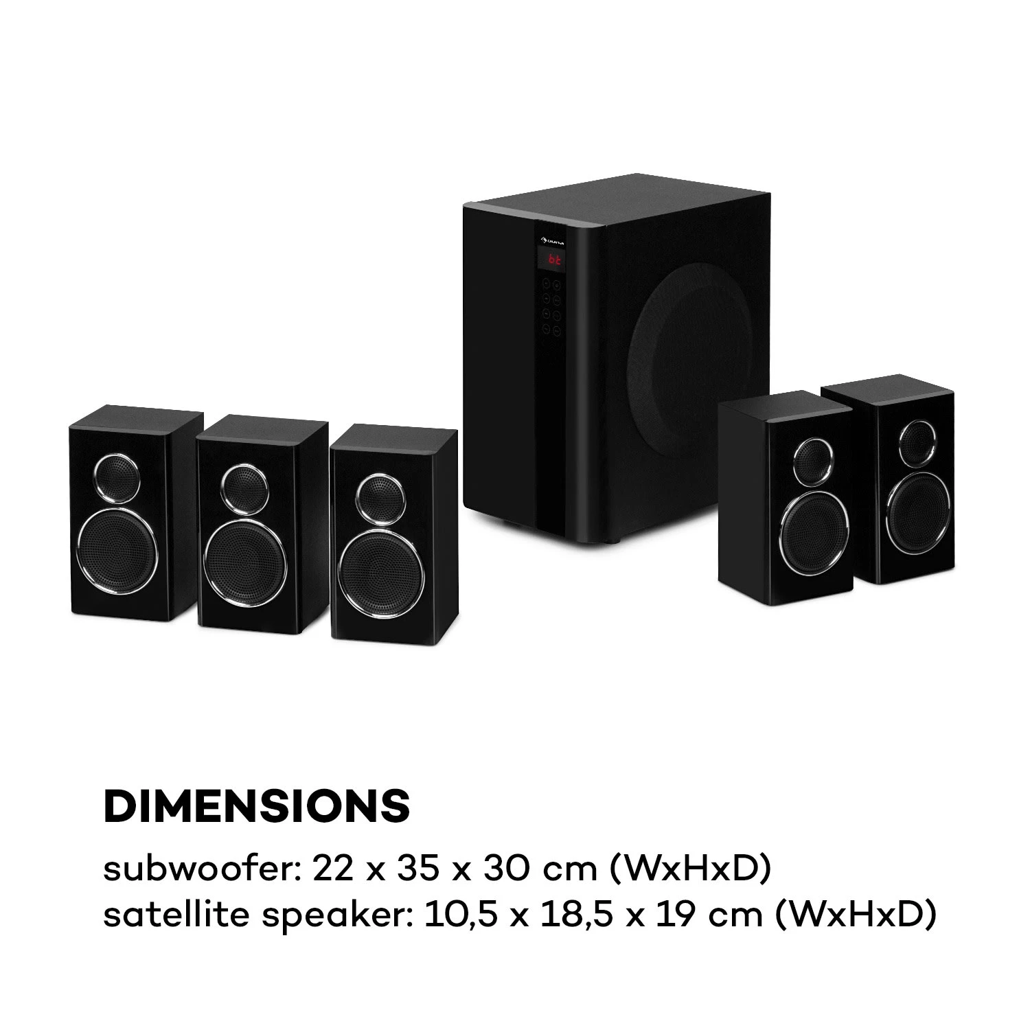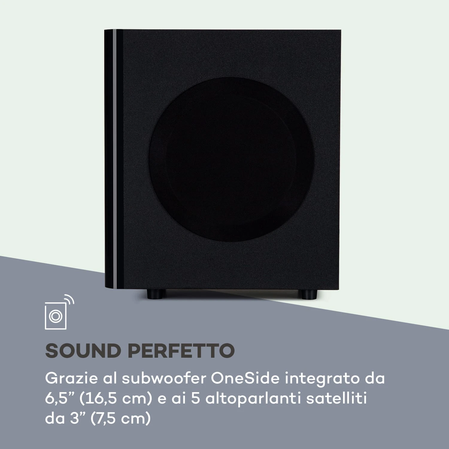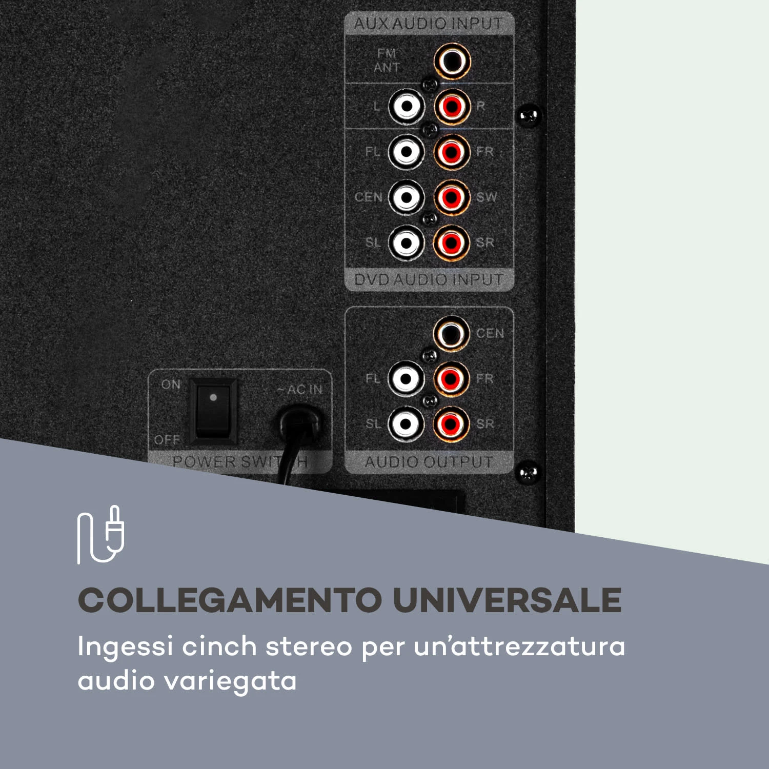 L’ingresso 5.1 del sistema di altoparlanti Areal Touch 5.1 di auna con una potenza di 95 Watt RMS riceve il segnale surround in entrata e lo distribuisce su 5 altoparlanti satellite da 3″ (7,5 cm) e sul potente OneSide Subwoofer da 6,5″ (16,5 cm). Tramite l’ingresso stereo RCA è possibile collegare al sistema di altoparlanti Areal Touch 5.1 di auna equipaggiamento audio di ogni tipo, come Playstation, lettore CD, lettore MP3, ma anche laptop e televisore. L’ingresso USB comunica con supporti esterni come chiavette USB e lettori MP3, mentre lo slot per schede SD/MMC permette di ascoltare titoli MP3 da schede di memoria. I singoli componenti del sistema di altoparlanti Areal Touch 5.1 di auna sono abbinati alla perfezione e il volume complessivo può essere regolato tramite display touch o telecomando alle condizioni della vostra casa e alle vostre preferenze, in modo da raggiungere una varietà sonora ottimale. Il Balanced Sound Concept garantisce inoltre una riproduzione bilanciata ed equilibrata.
