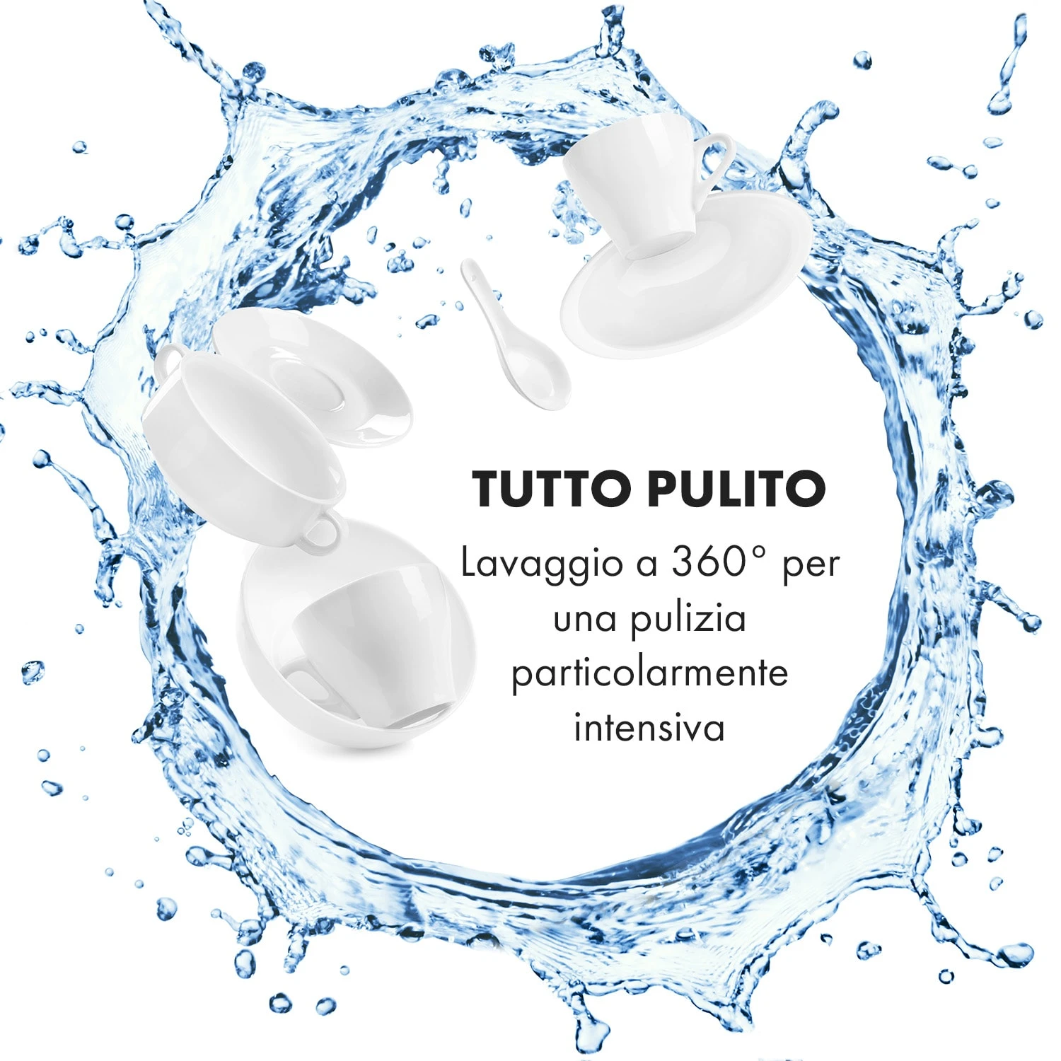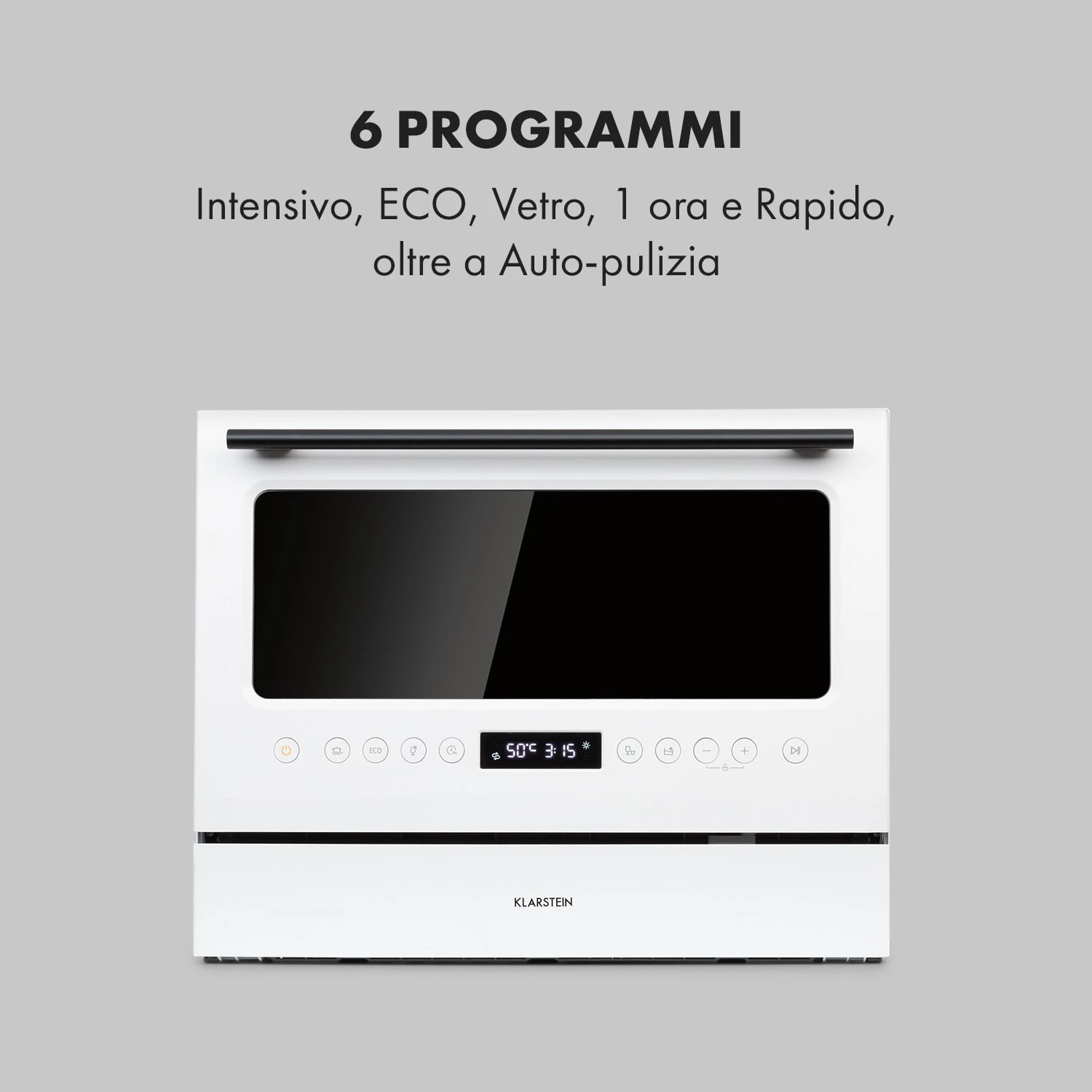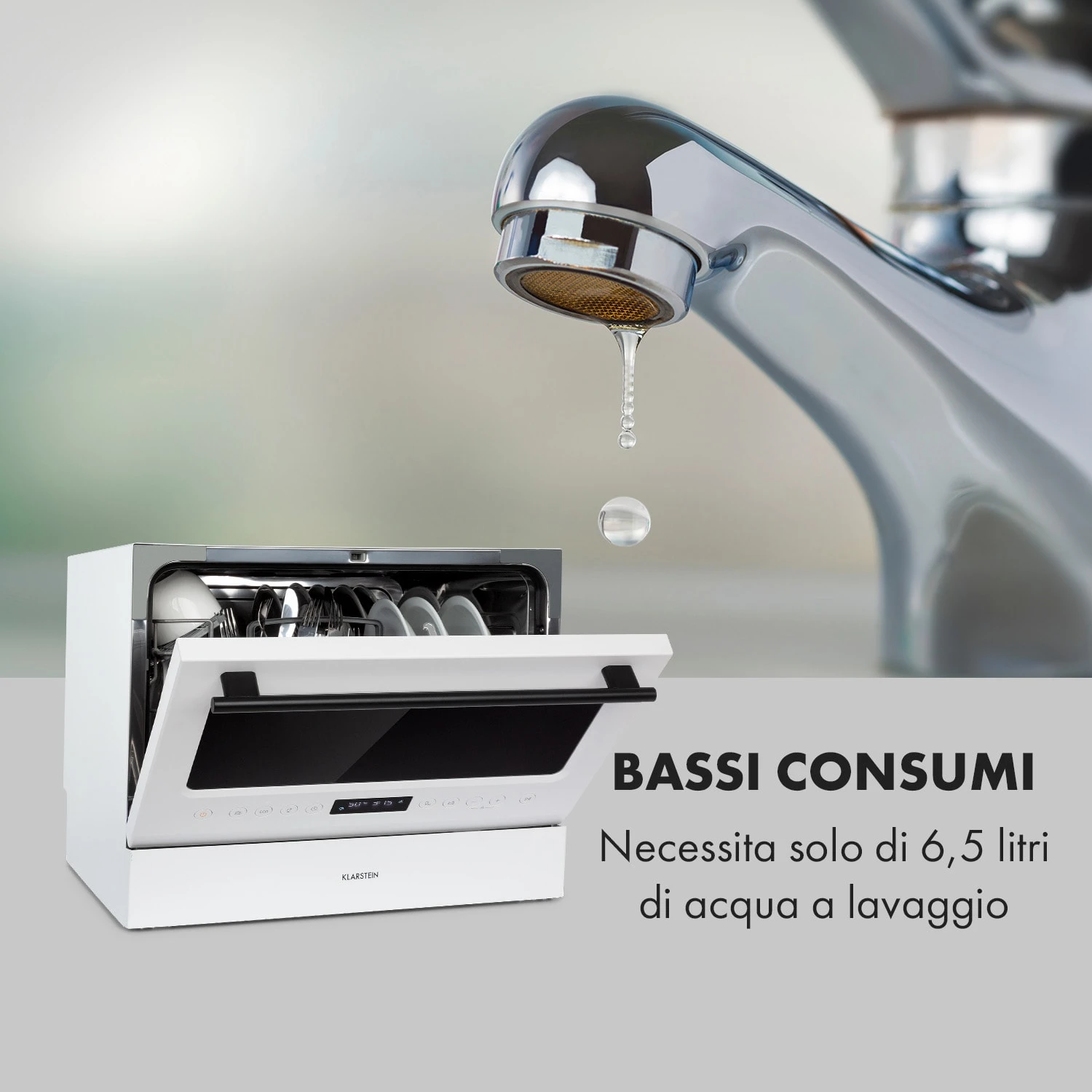 La lavastoviglie da tavolo Azuria di Klarstein è un dispositivo moderno e dall’aspetto stupendo, che fa risplendere i tuoi piatti con facilità. Con l’intuitivo controllo touch, puoi scegliere tra vari programmi di lavaggio e una funzione autopulente. All’interno della lavastoviglie c’è spazio per 6 coperti, che vengono lavati in modo affidabile ed ecologico, con un consumo di soli 6,5 litri di acqua per ogni ciclo. Grazie ai tubi di afflusso e scarico premontati, l’installazione risulta particolarmente semplice.