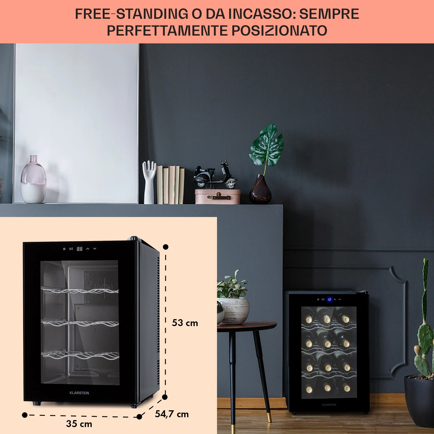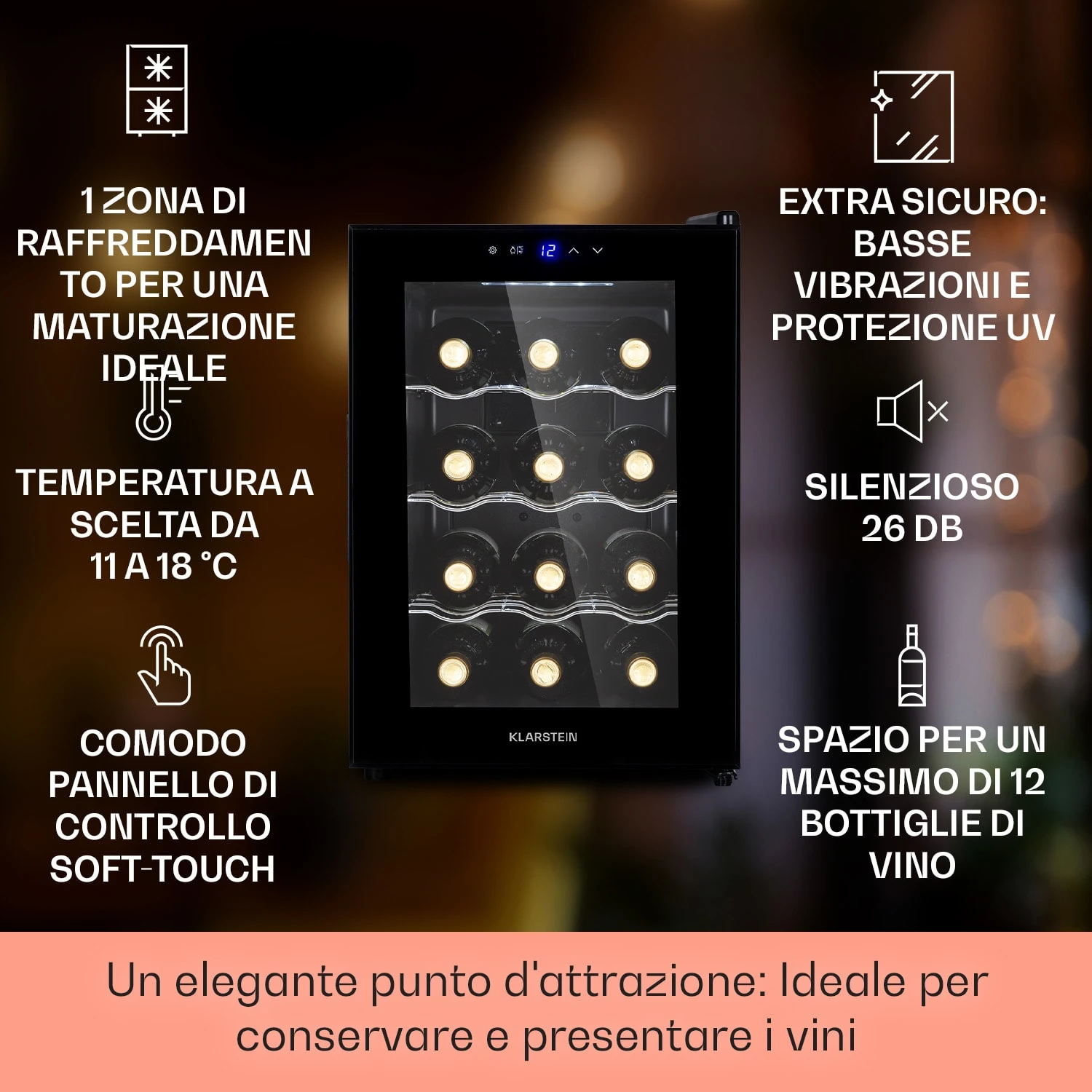 Praticità e un design raffinato, capace di impreziosire ogni ambiente: il frigorifero per vini Barolo 12 Uno di Klarstein.