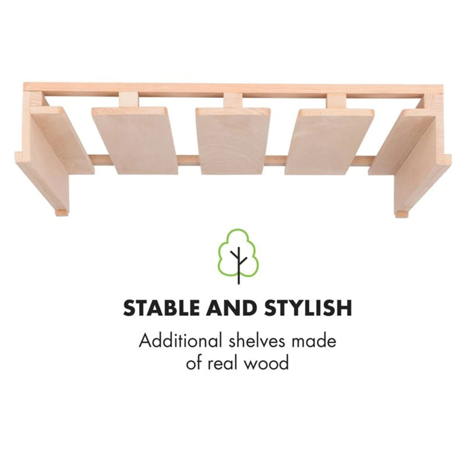 La temperatura è fondamentale: quasi niente è importante per un vino quanto la temperatura a cui viene consumato. Per fare in modo che questa non venga persa mentre si decanta il vino in un calice caldo, si consiglia di raffreddare anche i bicchieri. Per questo, il set Barossa 102 Duo di Klarstein include anche questo ripiano in vero legno per calici. Basta inserirlo nel frigorifero e appendere i calici sulle quattro guide per mantenerli al fresco.