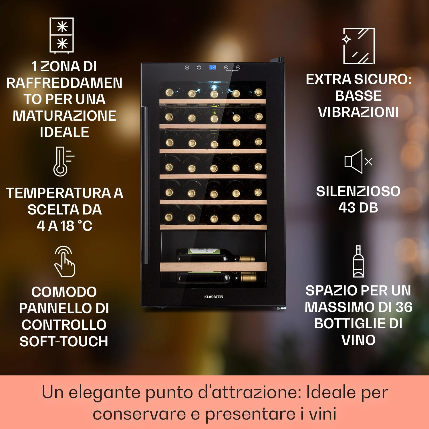 Per amore del vino: il frigorifero per vini Barossa 32 Uno di Klarstein assicura degustazioni impeccabili, permettendoti di conservare vini rossi o bianchi alla temperatura ideale. Lo sportello frontale in vetro presenta con raffinatezza i tuoi pregiati nettari, mentre l’illuminazione interna attivabile li mette sapientemente in risalto. Queste caratteristiche rendono la cantinetta frigo per vini un complemento assolutamente immancabile non solo in casa, ma anche presso bar e ristoranti.