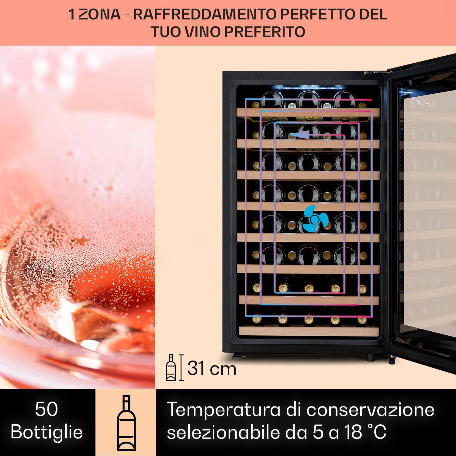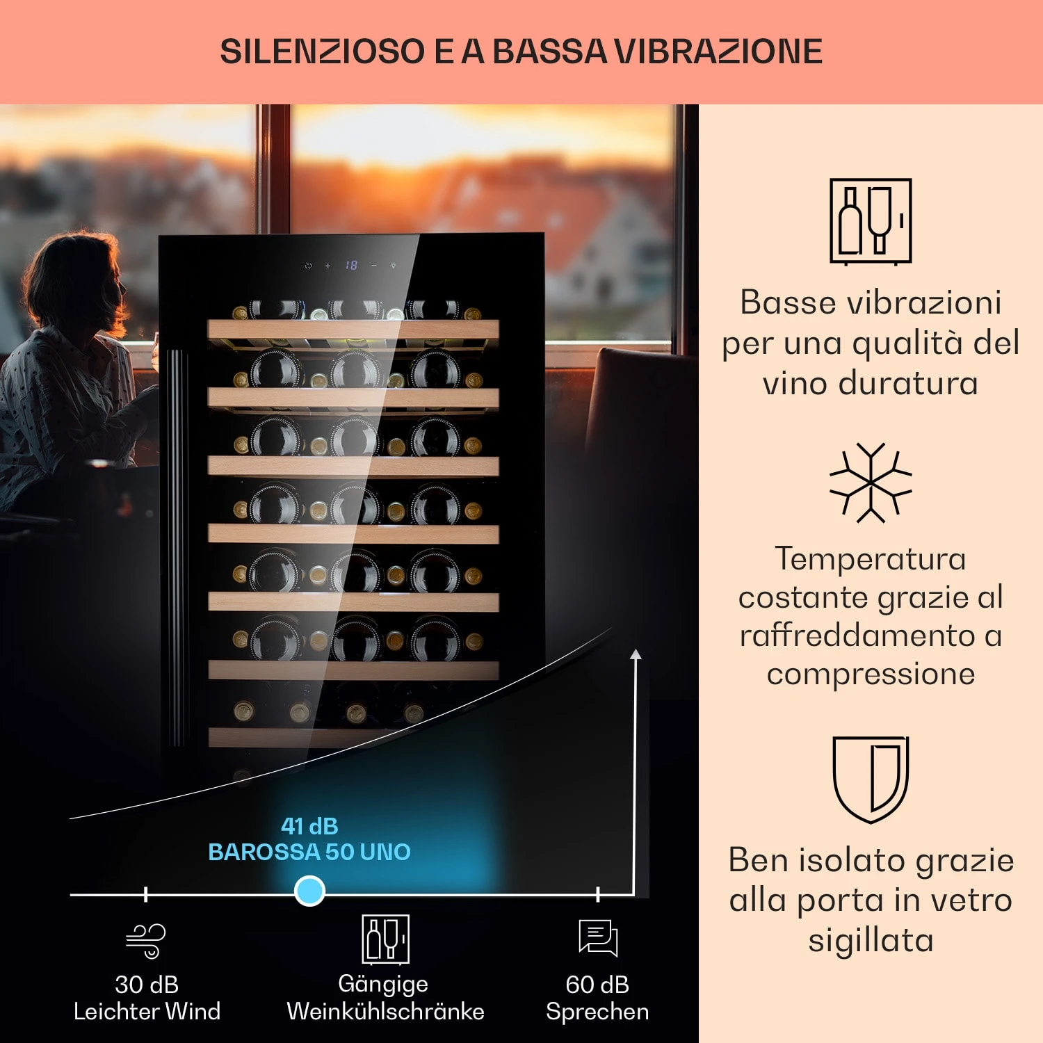Per amore del vino: il frigorifero per vini Barossa 50 Uno di Klarstein assicura degustazioni impeccabili, permettendoti di conservare vini rossi o bianchi alla temperatura ideale. Lo sportello frontale in vetro assicura una presentazione raffinata dei tuoi pregiati nettari, mentre l’illuminazione interna attivabile li mette sapientemente in risalto. Queste caratteristiche rendono la cantinetta frigo per vini un complemento assolutamente immancabile non solo in casa, ma anche presso bar e ristoranti.