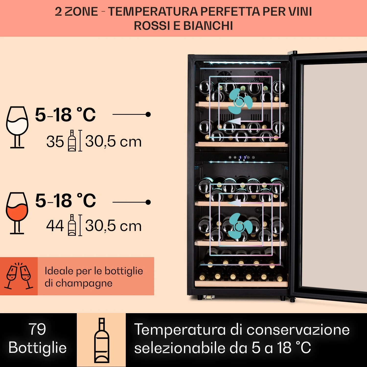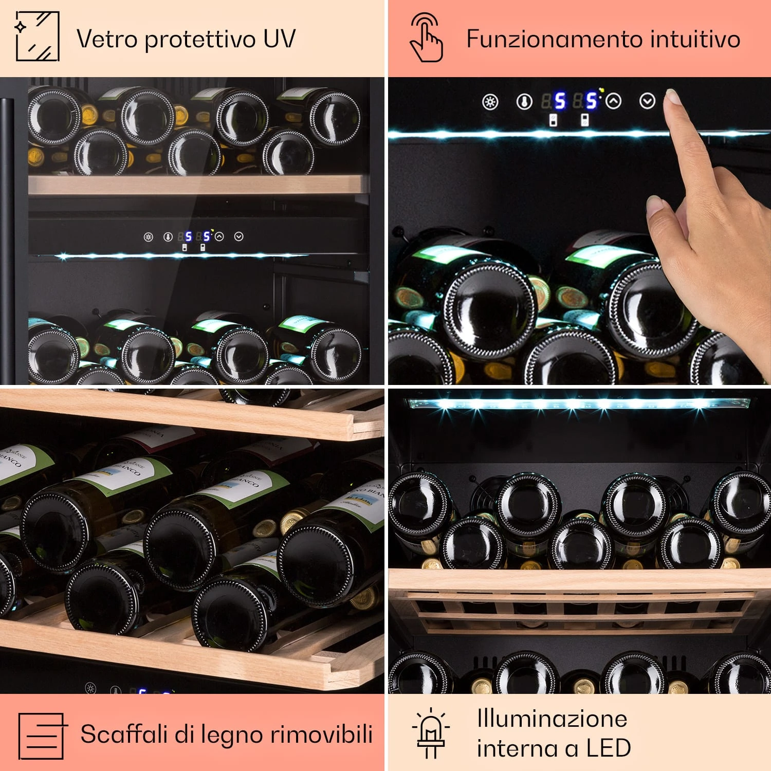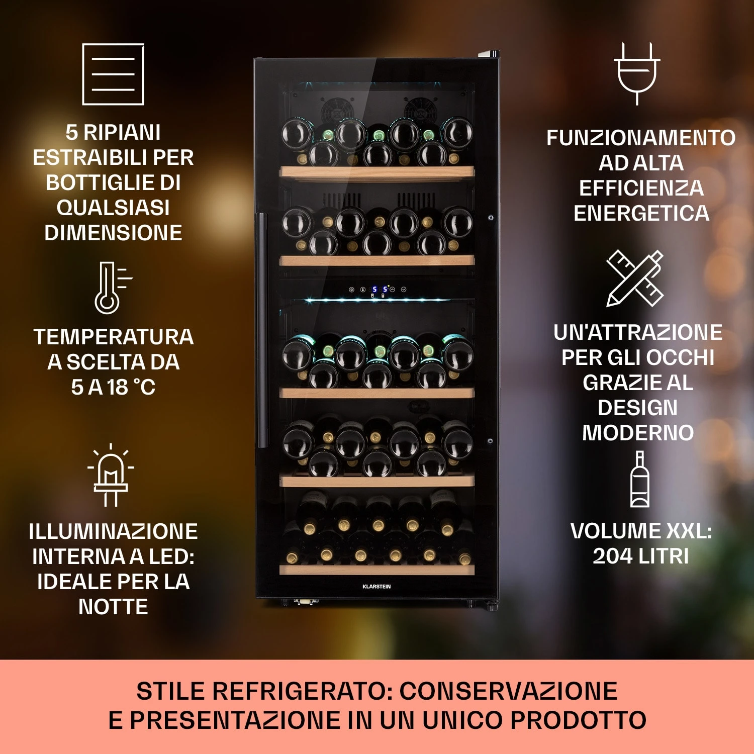 Sempre alla temperatura perfetta: grazie a due zone di raffreddamento separate, con il frigorifero per vini Barossa 79 Duo di Klarstein avrai sempre il vino giusto al momento giusto. Nelle zone di temperatura superiore e inferiore del frigorifero per vini Barossa 79 Duo di Klarstein potrai raffreddare alla perfezione fino a 79 bottiglie di vino su cinque ripiani di legno rimovibili. Il frontale in vetro di sicurezza con finestra panoramica assicura una presentazione elegante dei tuoi pregiati nettari. L’illuminazione interna attivabile si occupa di mettere ulteriormente in risalto le bottiglie conservate.