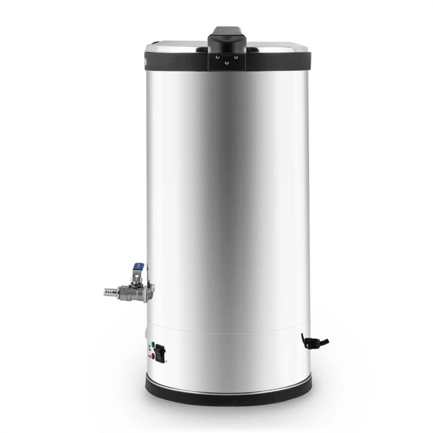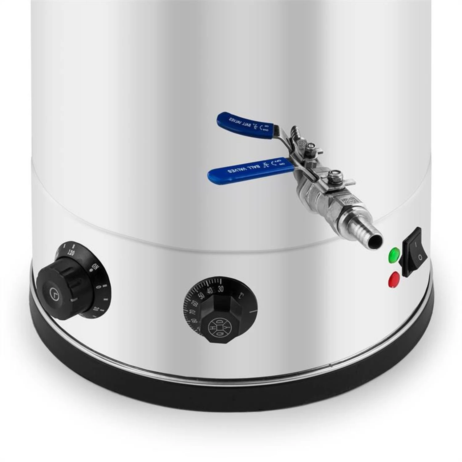 Nell’ampia caldaia in acciaio inox è possibile portare ad ebollizione fino a 30 litri di malto. La temperatura può essere regolata in continuo tra i 30 °C e 110 °C con una precisione di 2° Celsius. L’elemento riscaldante da  2585Wconsente al mosto di raggiungere la temperatura desiderata in brevissimo tempo. I due indicatori luminosi avvertono se il Beerfest è in fase di riscaldamento (luce rossa) o in fase di mantenimento della temperatura (luce verde). Una ulteriore manopola è predisposta per il timer, da 10 a 120 minuti. Un segnale acustico indica il termine del tempo impostato e l’elemento riscaldante si spegne. In questo modo non ci sarĂ alcuna perdita sostanziale dei punti di temperatura fondamentali per la lavorazione del mosto. Naturalmente, la caldaia può essere regolata anche per il funzionamento continuo.