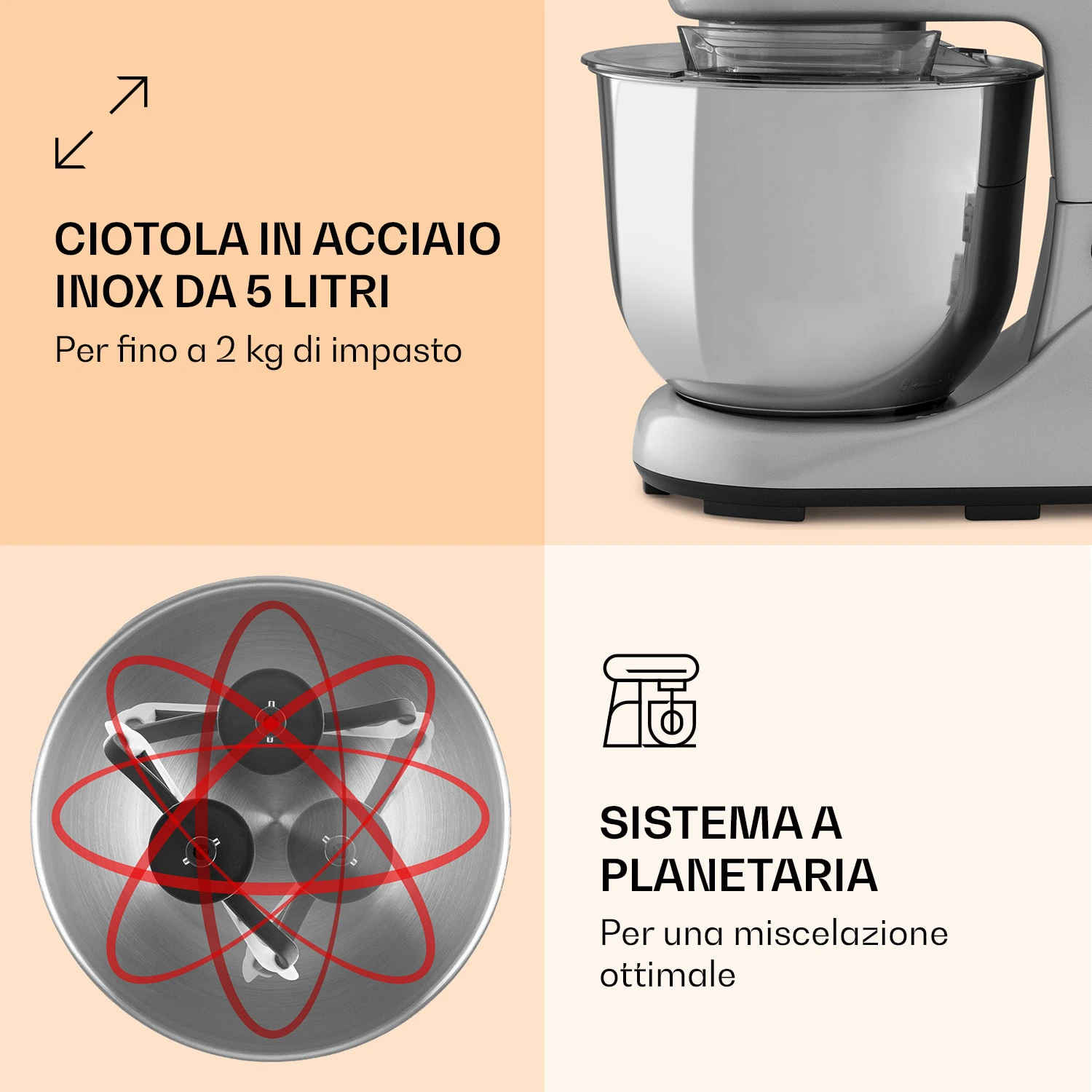 Potente e compatto: è facilissimo mescolare, impastare o montare con eleganza con il robot da cucina Bella Pico 2G di Klarstein. Con 1300 Watt, 6 livelli di potenza e il nostro sistema di movimento planetario affronterai ogni sfida dell’arte moderna della mantecazione. Nel recipiente d’acciaio inox da 5 litri tutti gli ingredienti vengono mixati alla perfezione. Le dimensioni compatte e il design colorato completano il robot da cucina.