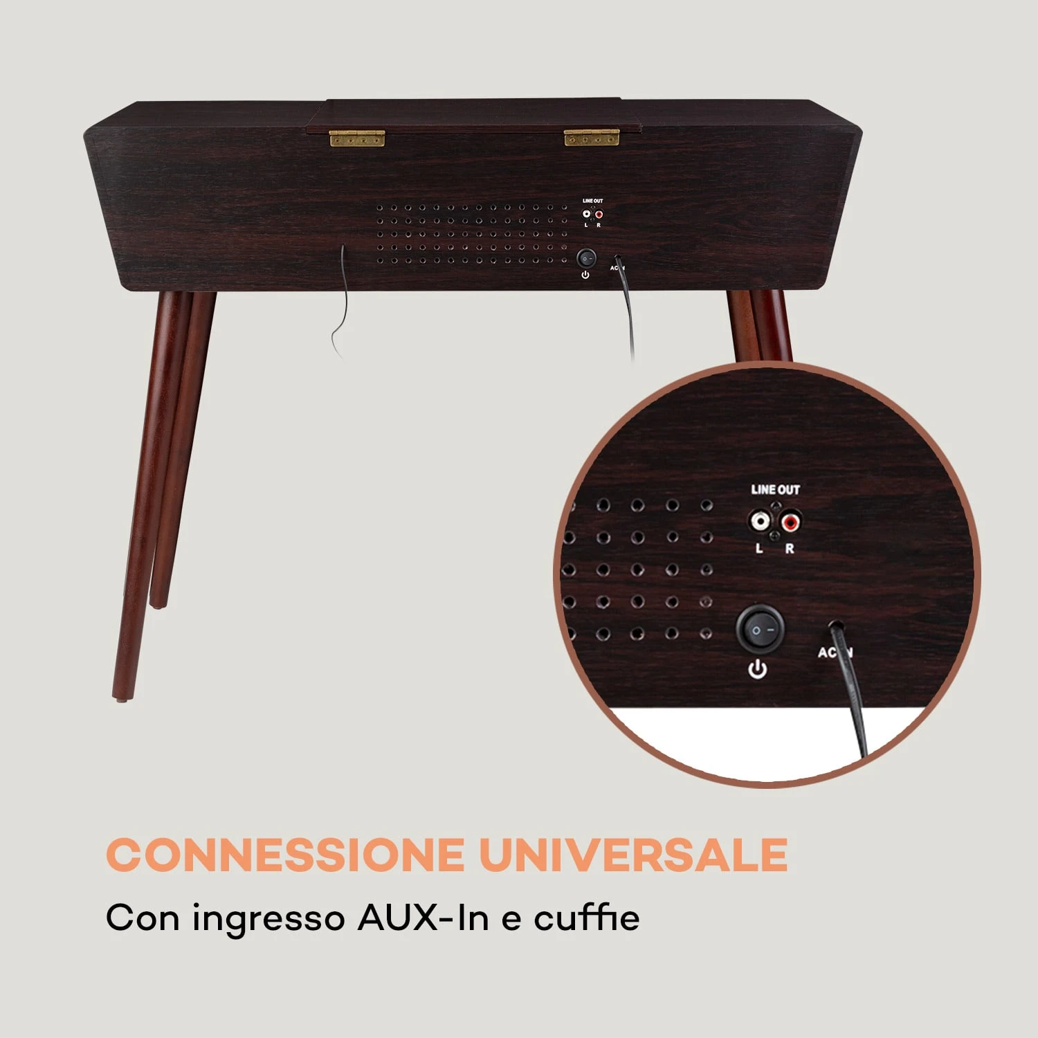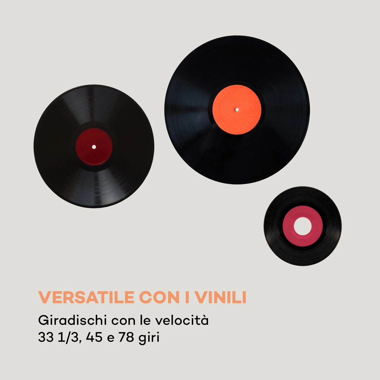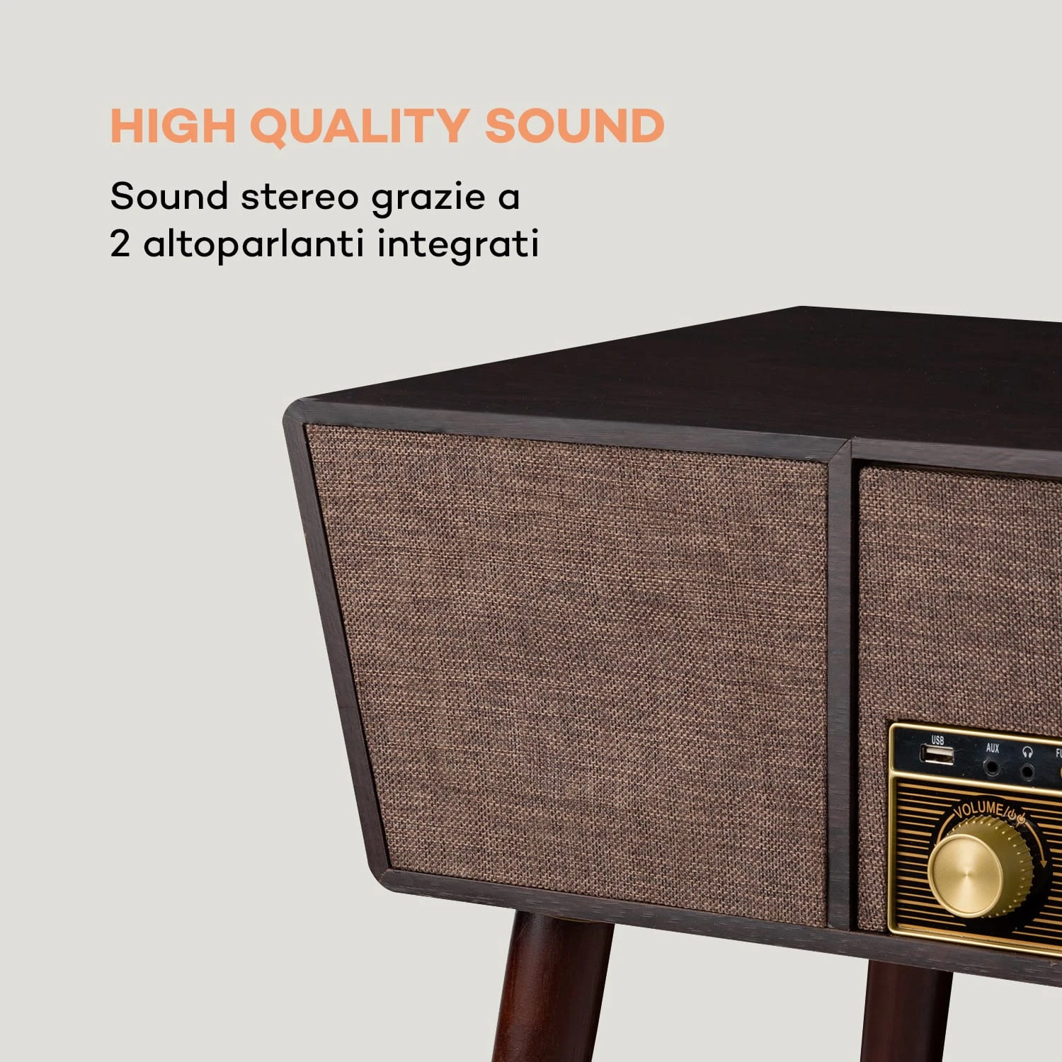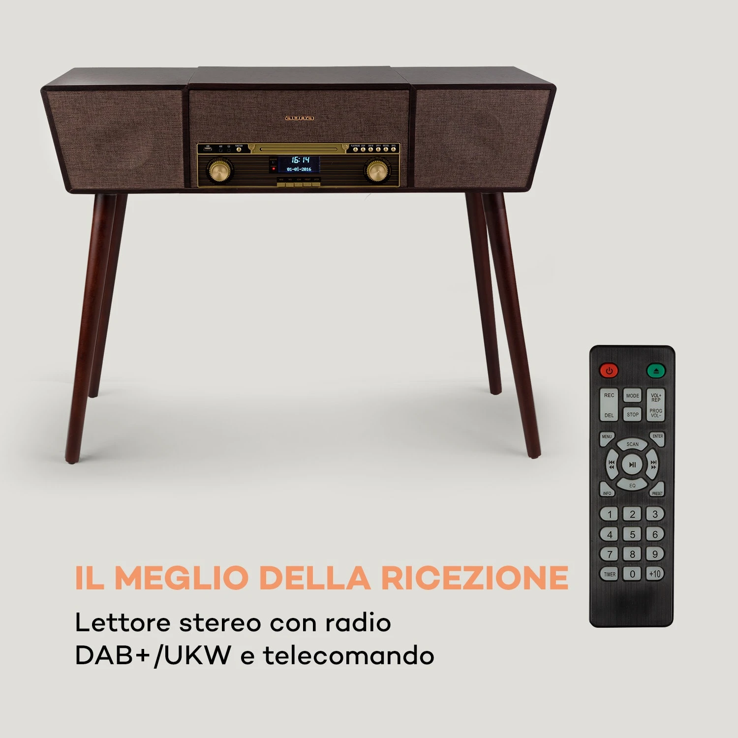 Delle tradizionali possibilità di riproduzione fa parte un giradischi che riproduce vinili nelle tre velocità 33 1/3, 45 e 78 giri/min. Inoltre l’impianto possiede un collegamento bluetooth per scaricare musica in streaming da smartphone, tablet o laptop, un lettore CD per CD MP3 e un sintonizzatore radio DAB+/FM. Per la riproduzione di formati più moderni, il giradischi retrò di auna dispone di un’interfaccia USB adatta agli MP3, dotata di funzione di registrazione: è possibile salvare la musica riprodotta dal giradischi o dal lettore CD su una chiavetta USB per poi rielaborarla sul PC.