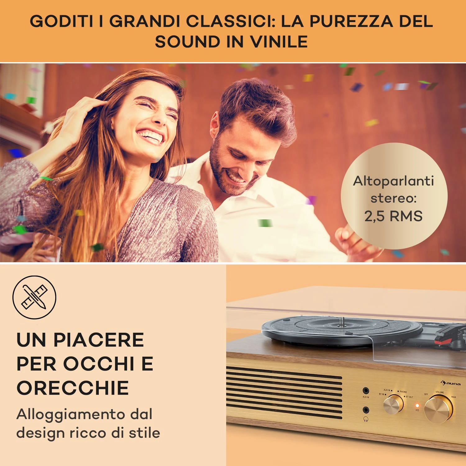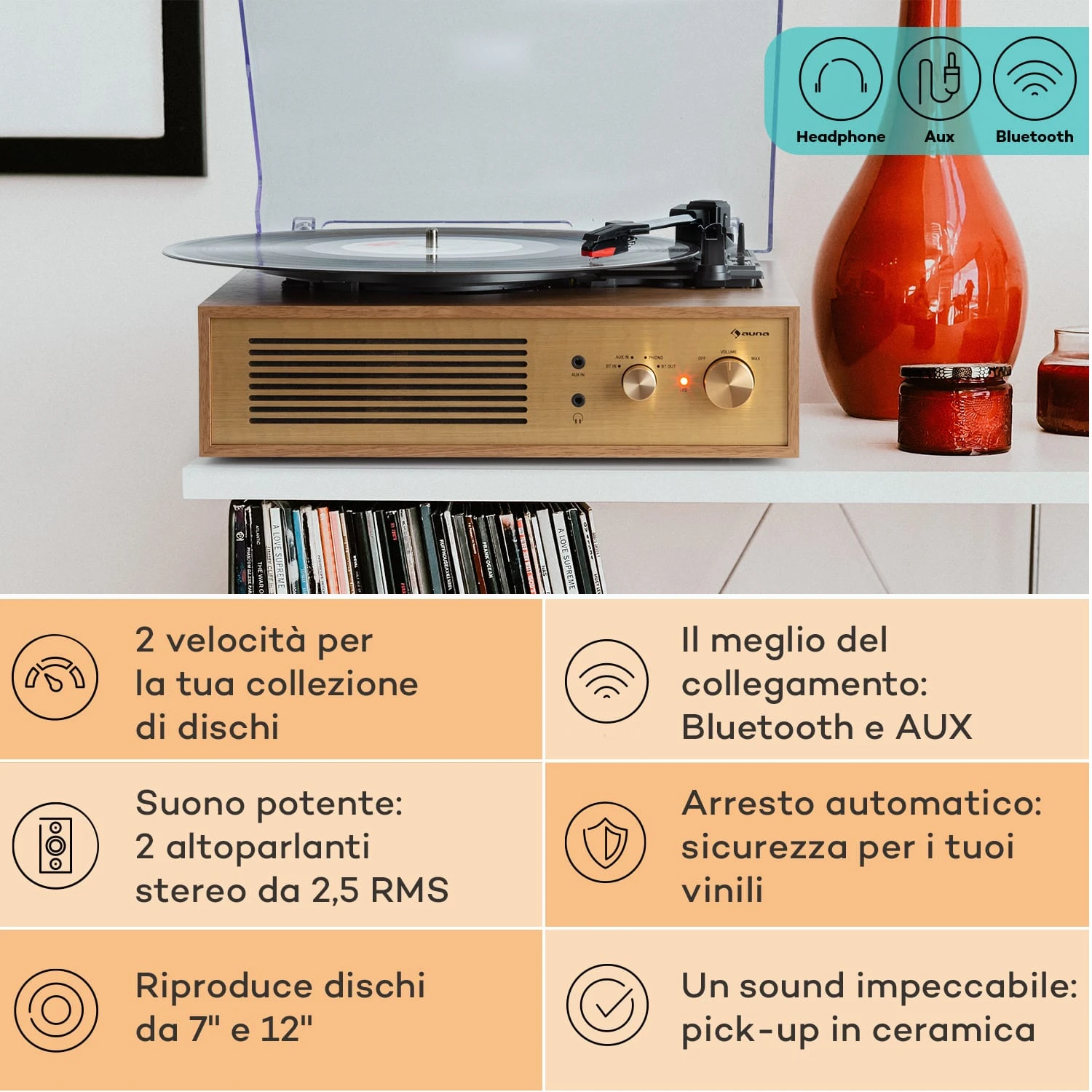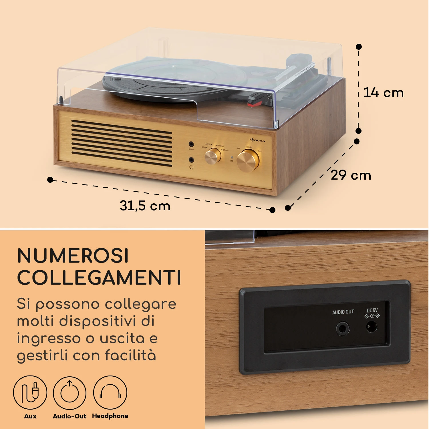 Un complemento di design dal look nostalgico, che ti permette di rispolverare la tua collezione di vinili: il piccolo ed elegante giradischi Berklee TT Classic di auna fa un figurone in ogni stanza e ti sorprende con esperienze d’ascolto straordinarie. Grazie all’adattatore per 45 giri incluso, potrai ascoltare in altissima qualità dischi longplay o single da 45 o 33 1/3 giri al minuto. Non finisce qui: oltre alla tua collezione di vinili, con questo fantastico giradischi puoi ascoltare addirittura file musicali digitali. Basta connettere PC, tablet o smartphone tramite Bluetooth o collegare altri dispositivi o supporti di memoria con l’ingresso aux. Due diffusori integrati assicurano un sound fenomenale, che può essere ulteriormente ampliato connettendo altre casse sul lato posteriore. La copertura trasparente protegge affidabilmente il giradischi dalla polvere.