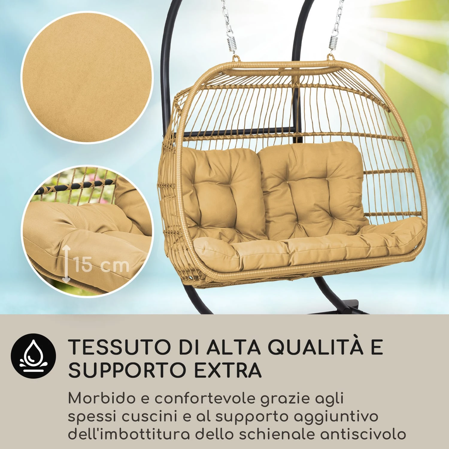 All’aria fresca sul Golfo di Biscaglia o sul balcone: con la poltrona sospesa Biarritz Double di blumfeldt rilassarsi come nella Belle Epoque è una garanzia, ogni volta che desideri. Il telaio a sfera in tubi di alluminio rivestiti con polyrattan e corde di nylon offre un sacco di spazio per due persone ed è reso particolarmente accogliente dal cuscino extra-spesso in poliestere. Il sistema di sospensione con molla e catena d’acciaio garantisce la sicurezza necessaria e permette di dondolarsi dolcemente, per il massimo del relax. Per conferire alla poltrona la necessaria stabilità e robustezza, il telaio resistente agli agenti atmosferici è realizzato in alluminio verniciato a polvere. Ciò significa che l’intera poltrona non è solo estremamente leggera, ma può anche sopportare facilmente un carico fino a 260 kg. Fornita come kit di montaggio, la poltrona sospesa Biarritz Double di blumfeldt può essere assemblata rapidamente e smontata nuovamente in pochi semplici passaggi, in modo da poterla trasportare con facilità. Praticissima risulta la possibilità di ripiegare il telaio a sfera, in modo da poterla riporre occupando pochissimo spazio.