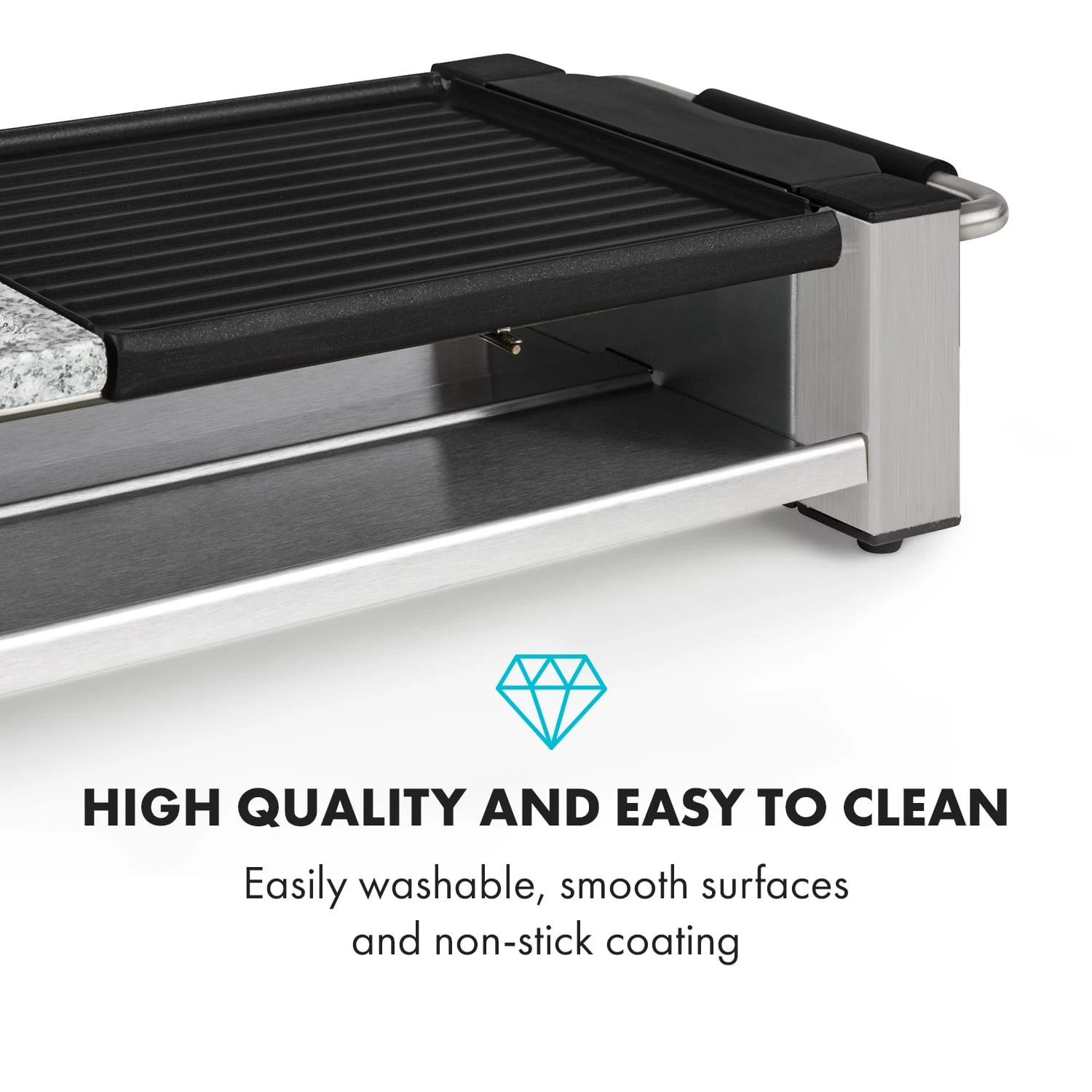 Con una potenza di 1200 Watt il raclette grill Bistecca di Klarstein fonde il formaggio e cuoce verdure o funghi in tempi record. La temperatura si regola semplicemente con il termostato. Grazie alla struttura su due livelli è possibile grigliare sia sopra che sotto. Mentre sotto si utilizzano le 8 padelle antiaderenti per gratinare il formaggio, sopra si riscaldano le piastre grill. Ce ne sono addirittura due a disposizione: una di metallo antiaderente e l’altra di pietra naturale in granito levigato. Entrambe offrono con i loro 19 x 20,5 cm e 19 x 17 cm abbastanza spazio per grigliare per tutti i presenti. Mentre la piastra di metallo trasmette il calore uniformemente e in modo rapido agli alimenti da grigliare che necessitano di poco olio grazie al rivestimento antiaderente, la pietra naturale brilla con il suo lungo immagazzinamento del calore per continuare a riscaldare anche dopo lo spegnimento. Quest’ultima è l’ideale per cuocere pizzette e altri impasti. Una spia incorporata indica quando il dispositivo è acceso o spento. Le piastre grill e le padelle si lavano facilmente grazie alle superfici lisce antiaderenti.