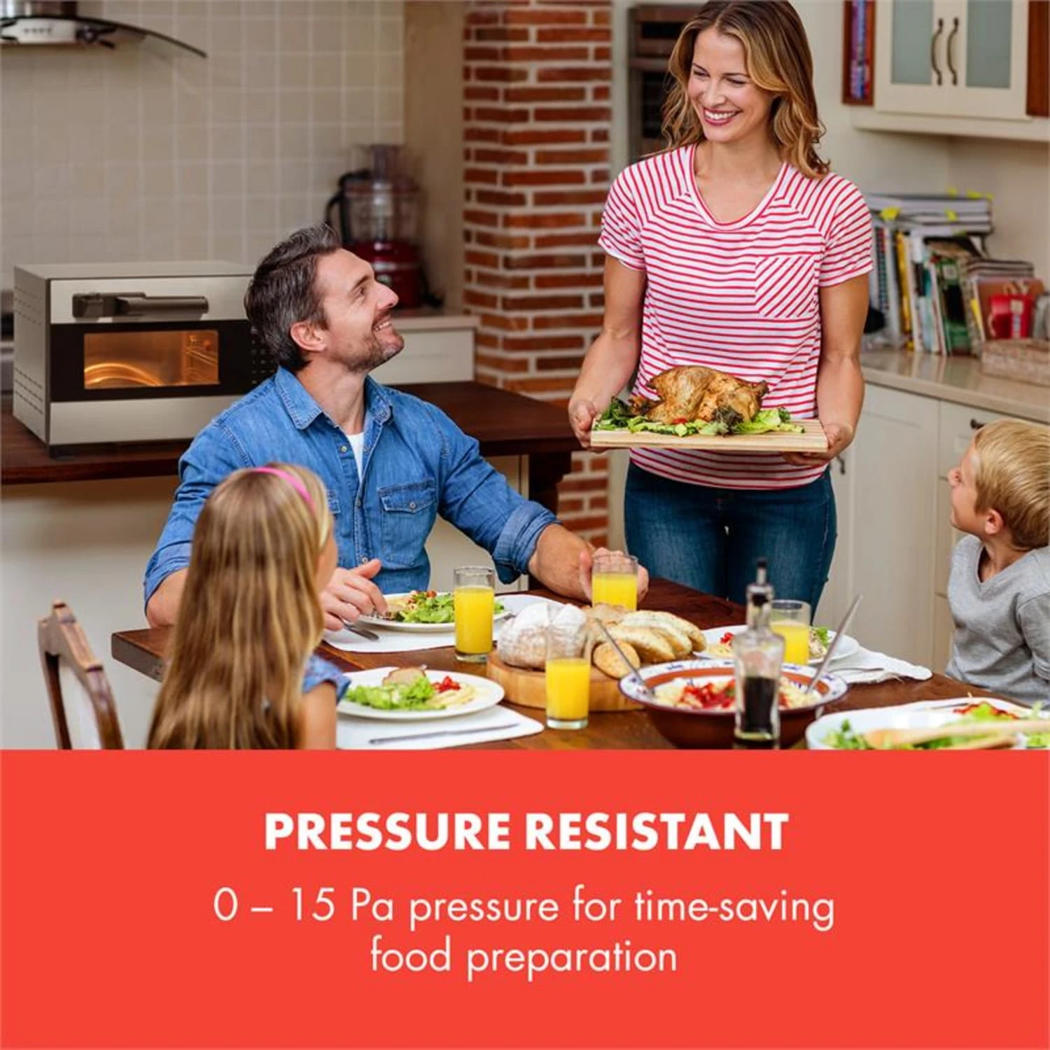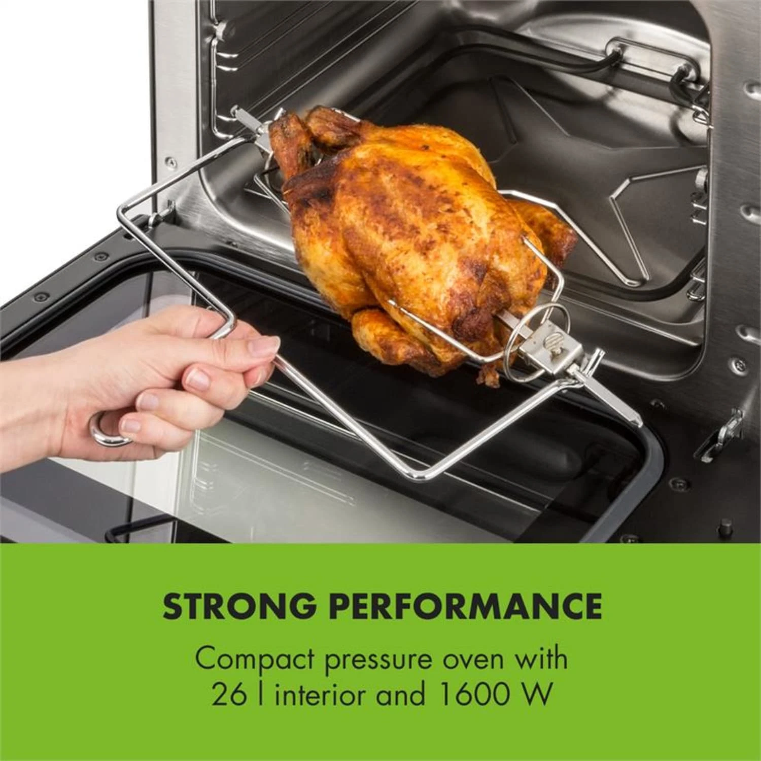 Nel forno a pressione Blaise da 26 l è possibile trasformare un pollo grosso o due piccoli in una croccante e succosa prelibatezza in soli 45 minuti, grazie alla funzione a pressione. Il forno a pressione Blaise è infatti fino al 35% più rapido rispetto a forni tradizionali. Attivando il girarrosto da 1600 W di potenza, possono essere preparati, oltre a pollo, anche gyros, spiedini di verdure, arrosti o stinchi di maiale.