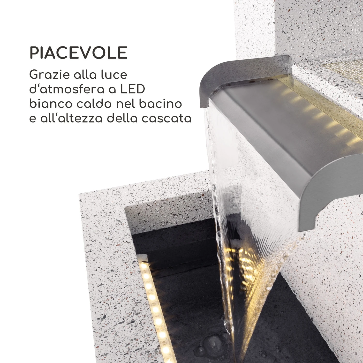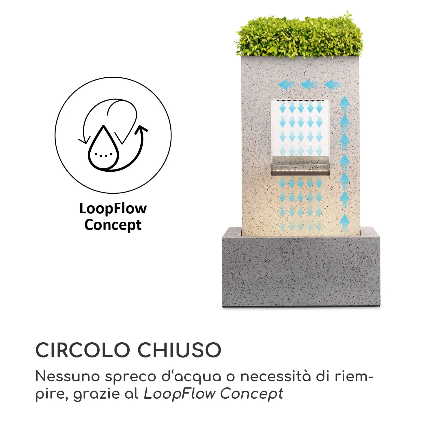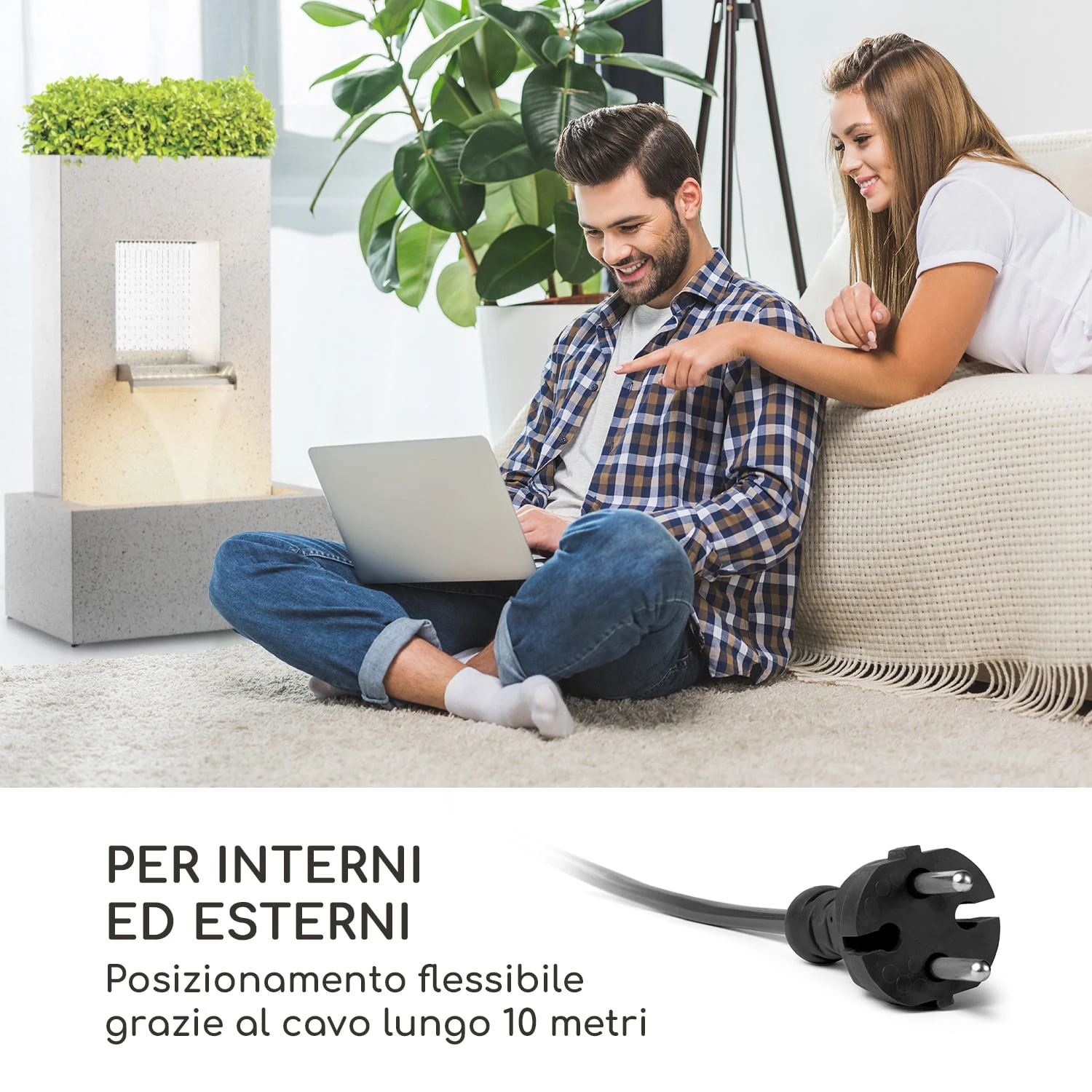 Terra e acqua si uniscono alla perfezione nella fontana decorativa Bloomingstone di Blumfeldt. La fontana ornamentale dal design moderno dispone di una fioriera incorporata sul lato superiore. Lo scarico sotto alla fioriera lascia che l’acqua goccioli in una vasca di raccolta come se stesse piovendo. Da questo piano l’acqua ritorna a scorrere a mo’ di cascata nella vasca della fontana. La fontana funziona con una pompa da 20 Watt, che fa risalire continuamente l’acqua verso l’alto. Grazie al LoopFlow Concept non è necessario alcun allacciamento alla rete idrica, perché la mini pompa mantiene l’acqua costantemente in ciclo. L’illuminazione bianca calda a LED nella vasca della fontana e all’uscita della cascata d’acqua rende tutto accogliente. La fontana decorativa Bloomingstone è di zinco e cattura decisamente l’attenzione con la finitura in terrazzo. Con il cavo di 10 metri è flessibilissima durante l’installazione e dà lustro a ogni balcone, giardino o soggiorno.