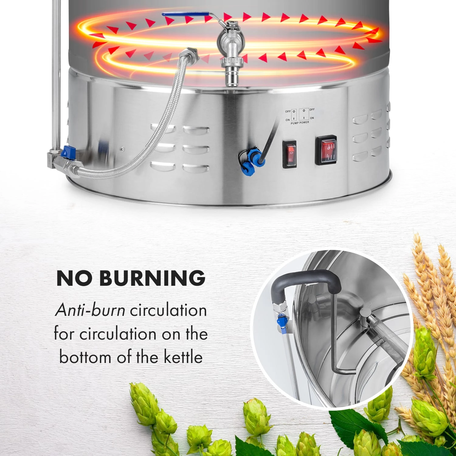 Praticissimo risulta il sistema di circolazione tridimensionale brevettato del paiolo di ammostamento Brauheld Pro di Klarstein: la MashFlow Technology pompa il mosto dal basso verso l’alto e garantisce una circolazione e un riscaldamento omogenei. L’Anti-Burn-Circulation supporta la miscelazione, garantendo movimento costante sul fondo del paiolo.