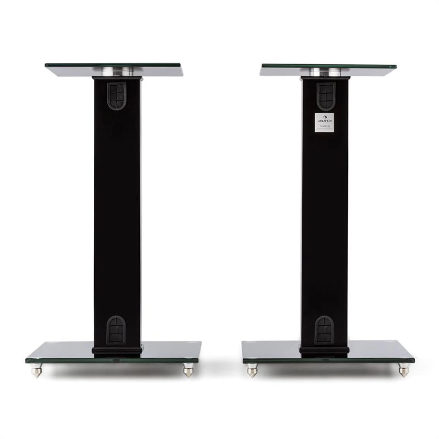 I materiali pregiati dei sostegni per cassa auna – vetro stratificato colorato e una colonna squadrata in alluminio – si adattano alla perfezione ad ogni tipo di arredamento. Per rendere ancora più pulito ed elegante l’aspetto dei sostegni per casse troviamo un canale per i cavi con copertura nera.
