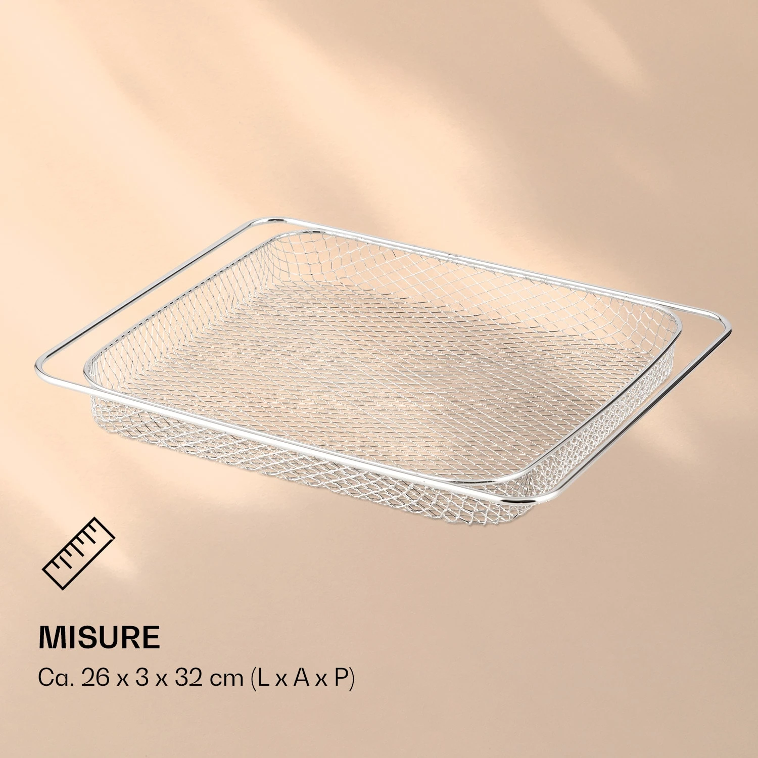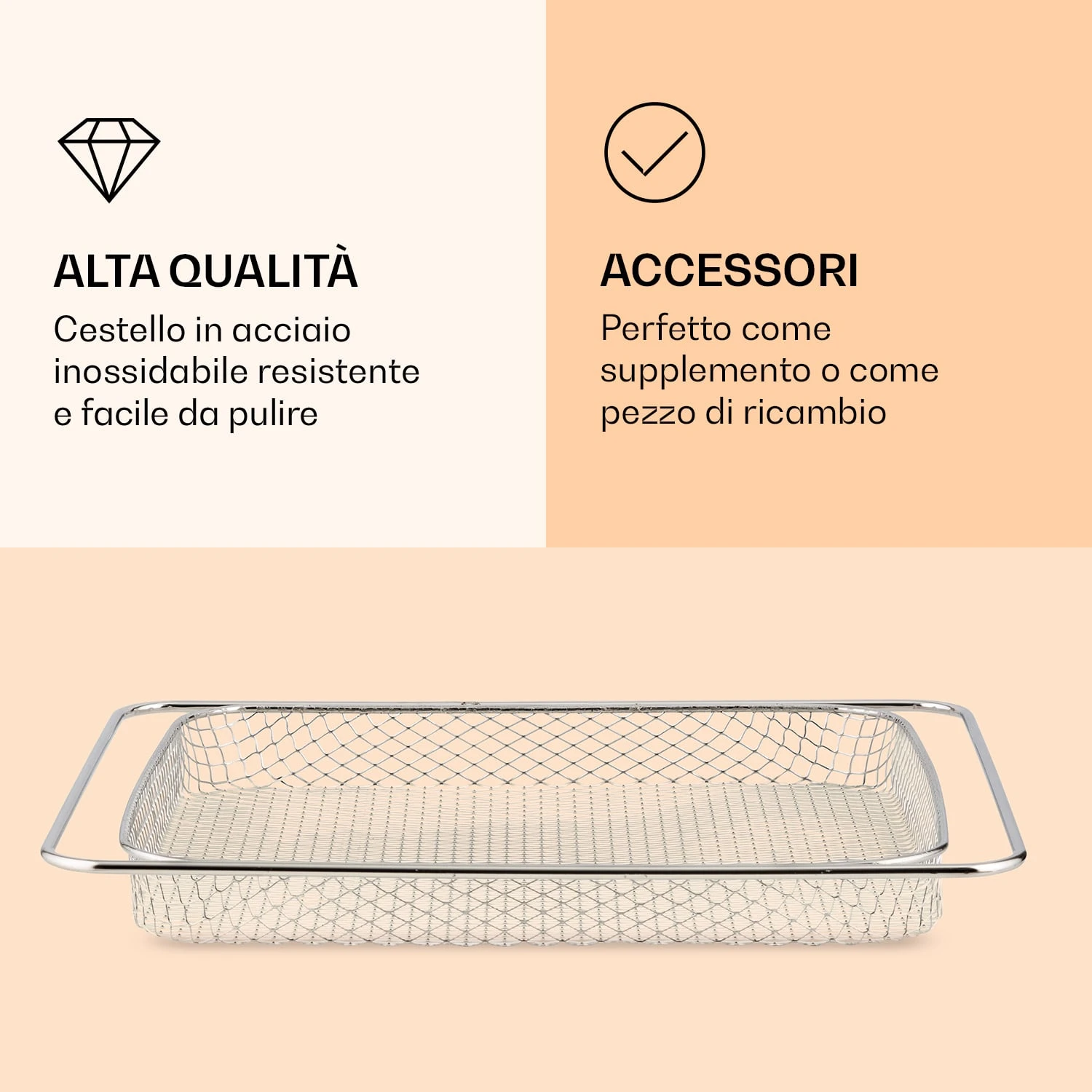Il cestello della friggitrice ad aria calda AeroVital Chef Cube di Klarstein è ideale per preparare fritti di piccole e grandi dimensioni, come alette di pollo o crocchette. La griglia a maglie strette impedisce al cibo di fuoriuscire permettendo all’aria calda di friggere uniformemente su tutti i lati. Realizzato in acciaio inossidabile, il cestello è particolarmente resistente e facile da pulire.