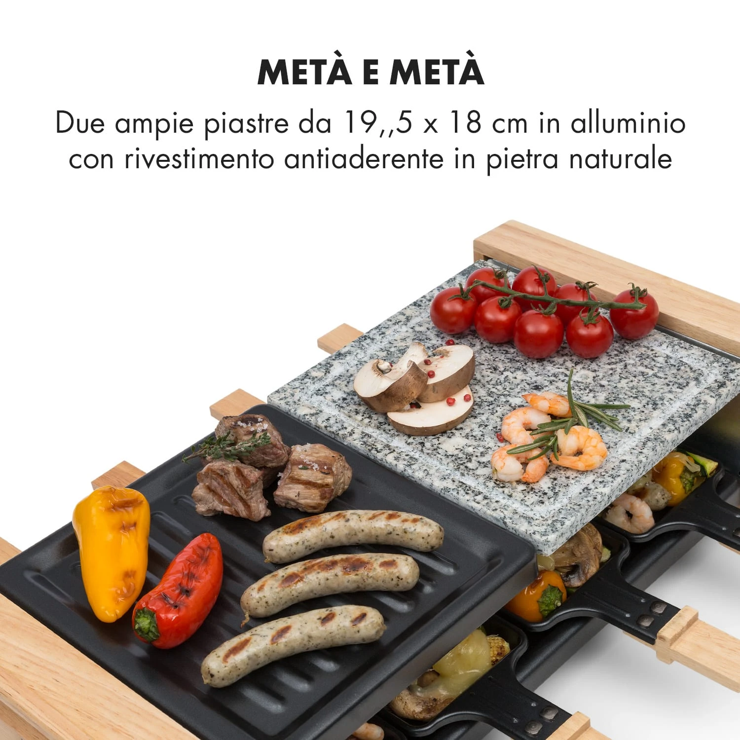 Potente con 1200 watt, il Klarstein Chateaubriand Nuovo Raclette grill fonde formaggio, cuoce carne e verdure o funghi in tempo record. La temperatura può essere regolata facilmente con un termostato. Grazie alla duplice struttura, le grigliate si svolgono su due livelli. Mentre in basso le 8 vaschette in acciaio con rivestimento antiaderente sono utilizzate per la gratinatura del formaggio, in alto le piastre della griglia sono adeguatamente riscaldate. Ci sono due piastre disponibili: una è una lastra di alluminio con rivestimento antiaderente e l’altra è una lastra di pietra naturale in granito lucidato. Con una dimensione di 19,5 x 18 cm, entrambe offrono spazio sufficiente per grandi grigliate a tavola. Mentre la griglia metallica trasferisce uniformemente e rapidamente il calore al cibo e, grazie al rivestimento antiaderente, richiede pochissimo grasso per la cottura alla griglia, la pietra naturale brilla con il suo lungo accumulo di calore in modo da poterlo mantenere a lungo anche dopo lo spegnimento. Quest’ultima griglia è adatta anche per la cottura di mini pizze e altri piccoli pezzi di pasta. Per accendere facilmente la griglia e svuotare le pentole,è possibile utilizzare una delle 8 spatole che si trovano in dotazione .