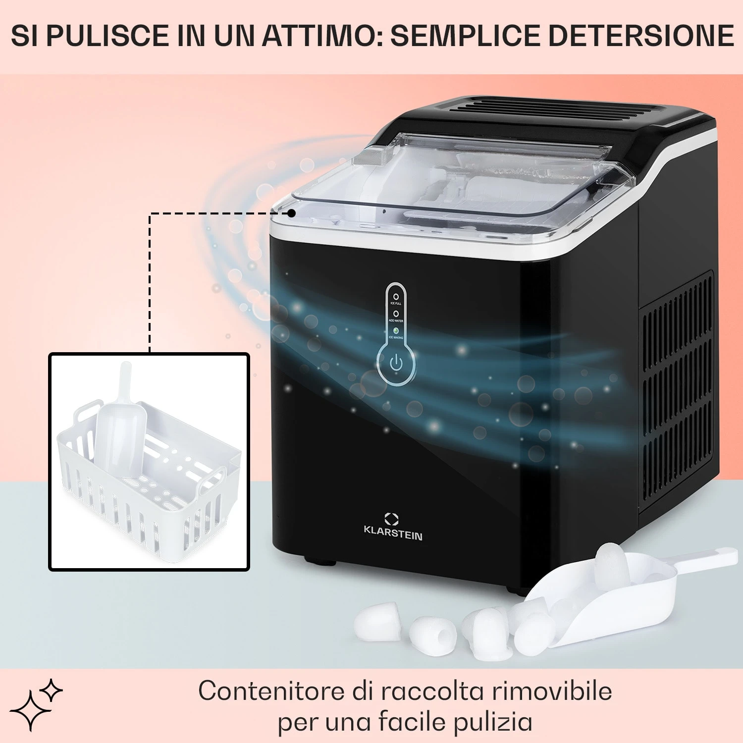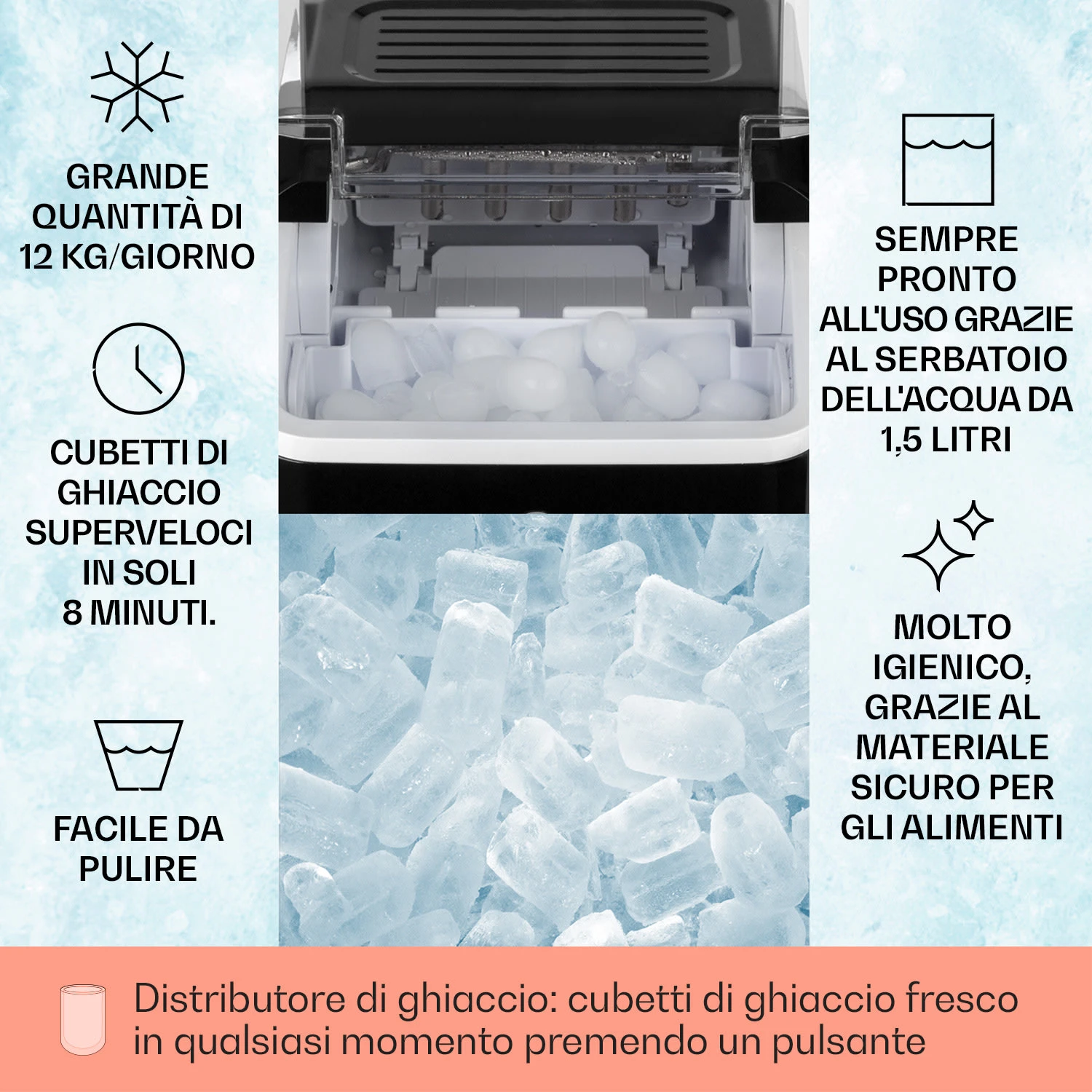 La potente macchina del ghiaccio produce fino a 12 kg di ghiaccio in un giorno ed è ideale per party o feste in giardino. Nella fase di progettazione abbiamo prestato particolare attenzione alla facilità di utilizzo del dispositivo: basta aggiungere acqua, accenderlo e dopo soli 8 minuti sentirete i primi 9 cubetti a forma di pallottola cadere nel cestello di raccolta. Non è necessaria alcuna impostazione, dato che il funzionamento è totalmente automatizzato. Indicazioni LED avvertono se il livello dell’acqua è troppo basso o se il cestello di raccolta è pieno. Grazie allo sportello trasparente potete sempre controllare la quantità di ghiaccio rimanente. Una paletta inclusa permette di porzionare comodamente il ghiaccio per i drink, mentre la possibilità di sollevare tutto il cestello di raccolta rende facilissimo lo riempimento di contenitori per la conservazione di pesce fresco o similari. Dopo l’uso, il resistente alloggiamento è facile da pulire. Il design elegante con copertura trasparente assicura il perfetto inserimento in ogni tipo di ambiente. Inoltre, il peso contenuto rende pratico il trasporto del dispositivo, in modo da avere sempre ghiaccio a disposizione.