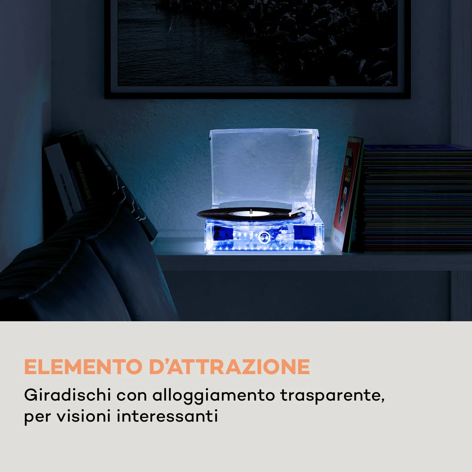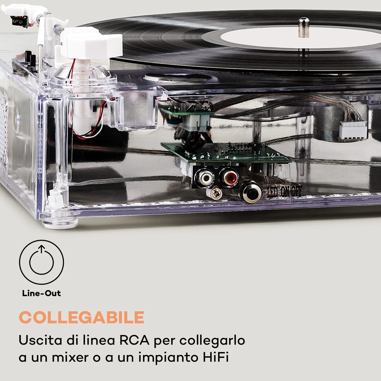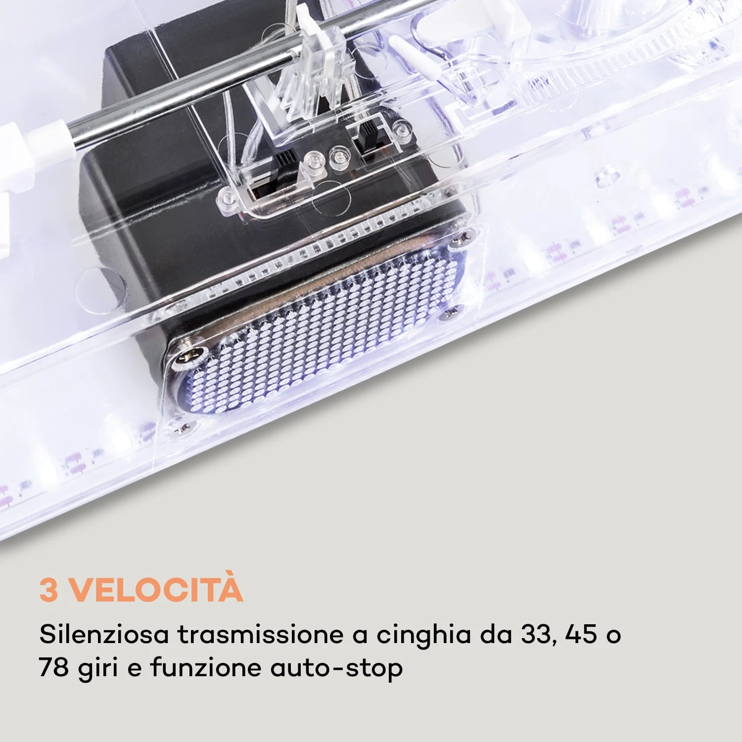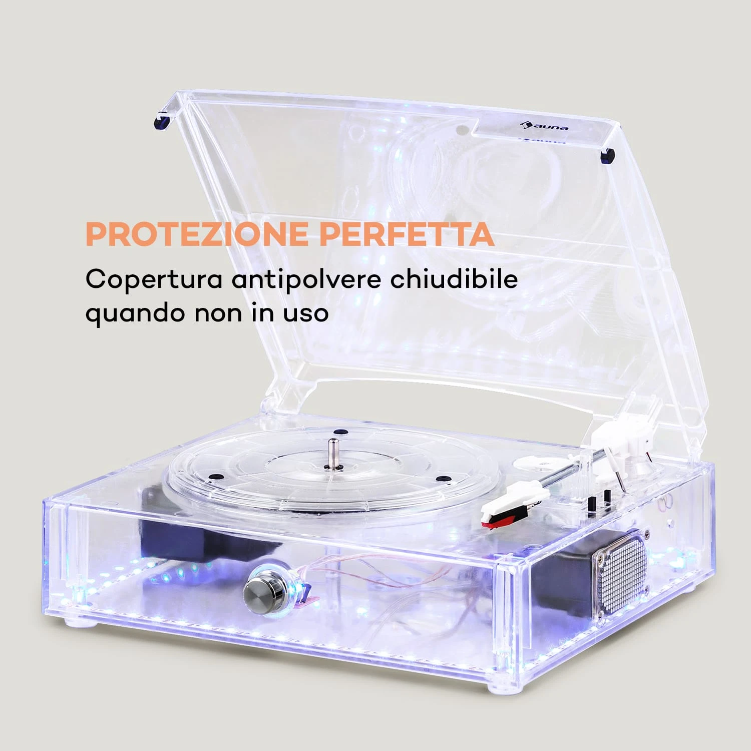 Ridotto all’essenziale, il giradischi ClearTech di auna convince per la facilità di utilizzo e i suoi componenti moderni. Il suo alloggiamento trasparente ti permette di osservare il funzionamento tecnologico all’interno e, se vuoi, si illumina con una stupenda luce blu a LED.