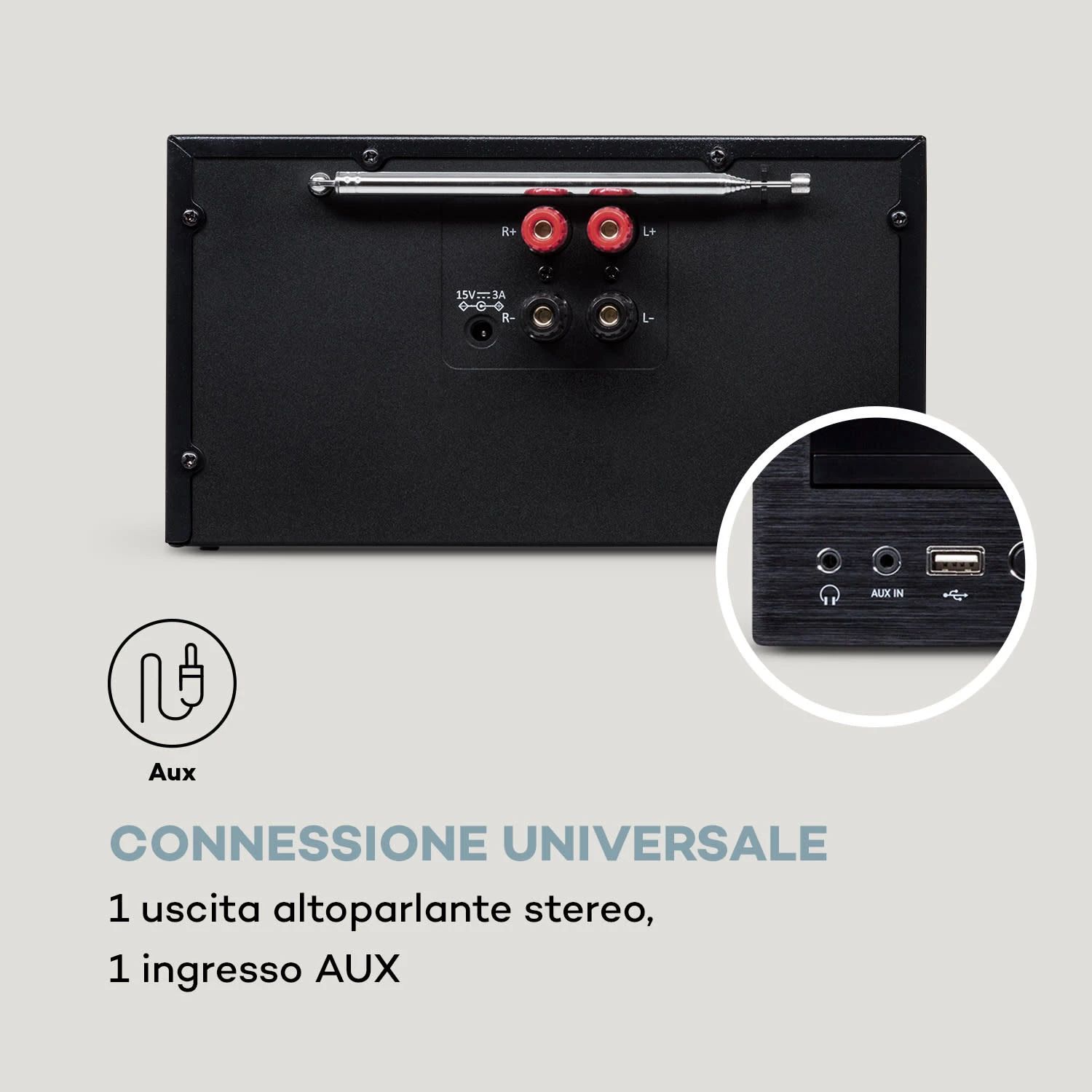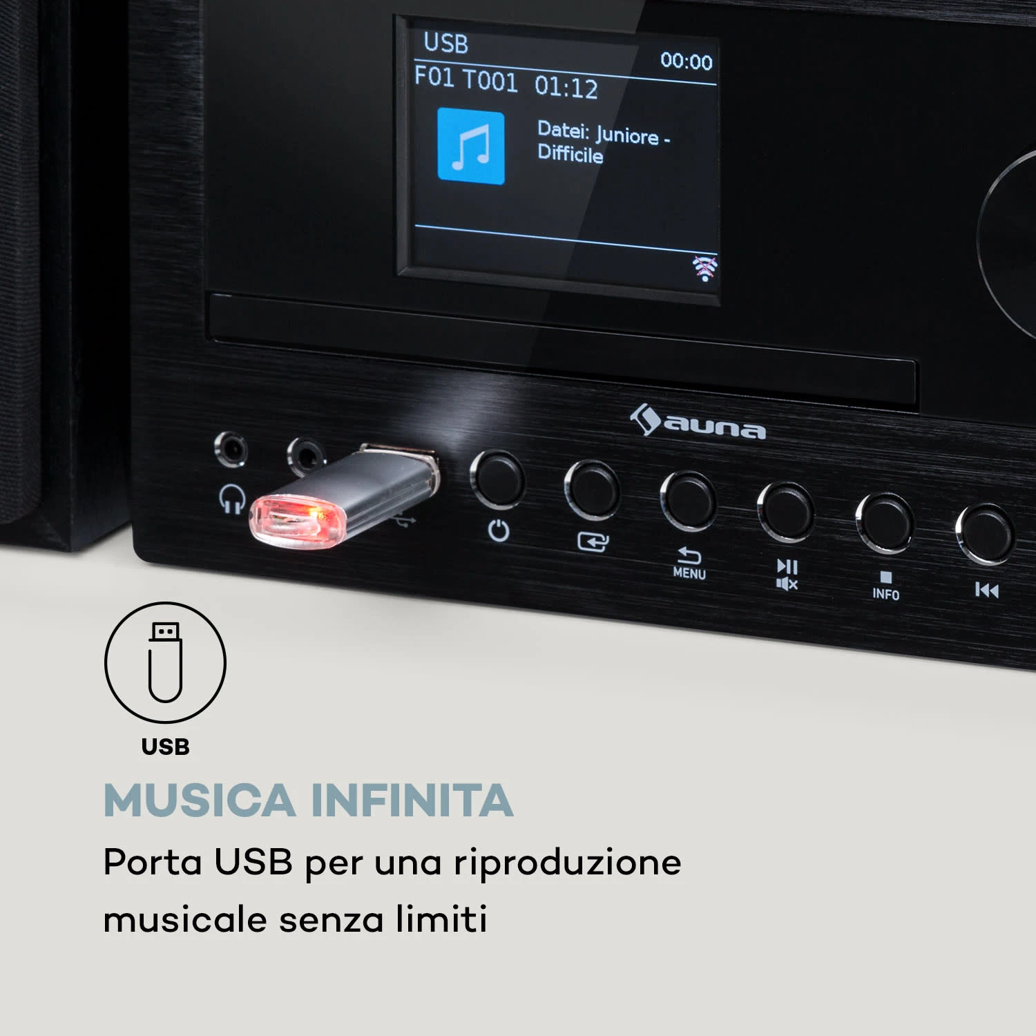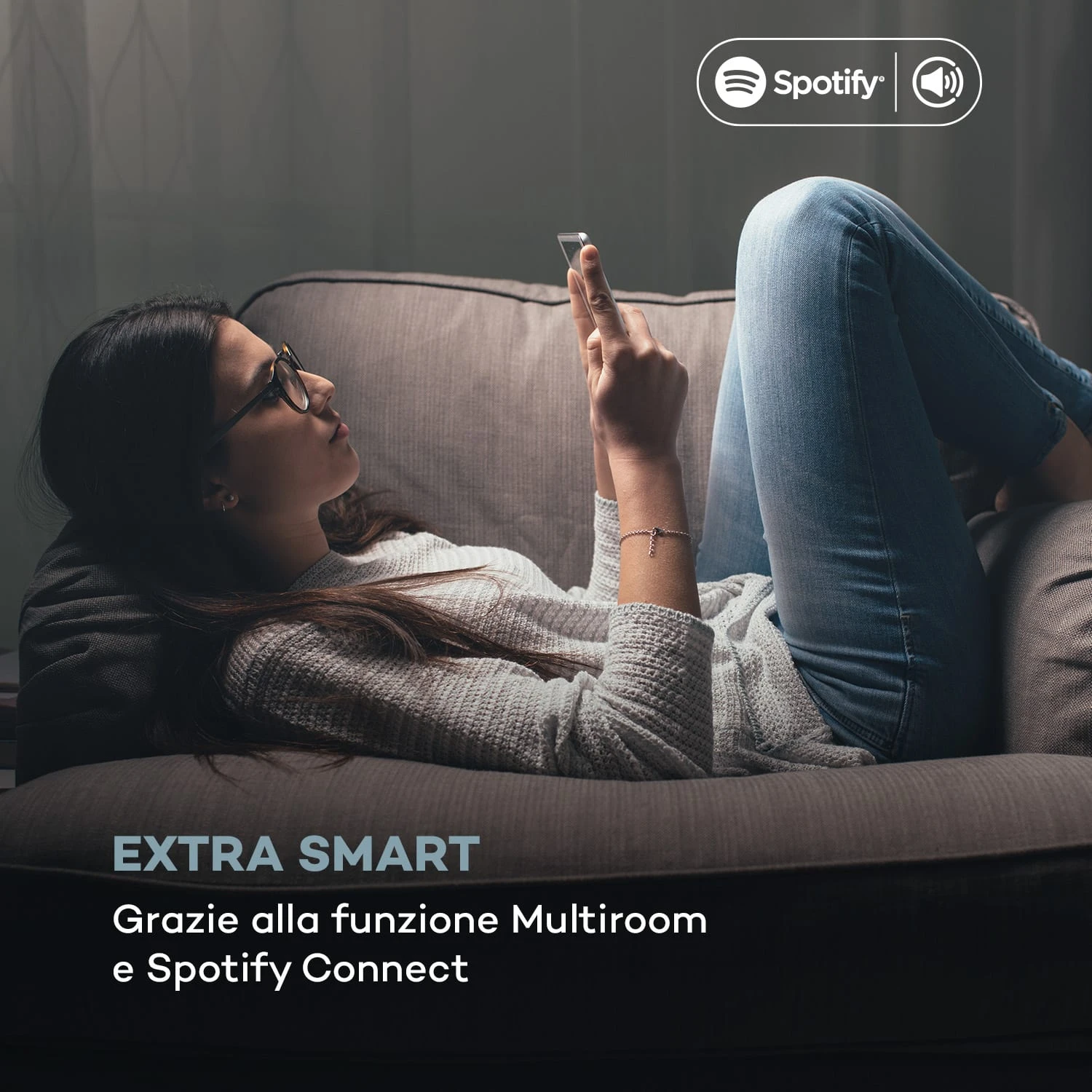 Il Sistema stereo auna Connect System è un sistema stereo con 2 altoparlanti da 15 watt RMS che arricchisce la tua casa con un suono di alta qualità e, grazie a molte funzioni, riproduce la musica giusta al momento giusto. Il tuttofare con radio web/DAB+/FM integrate riceve fino a 10.000 stazioni e presenta WiFi, un moderno lettore CD, una porta USB per la riproduzione di MP3 e un ingresso AUX. Particolarmente degna di nota è la funzione Bluetooth con Spotify Connect, che, grazie al Connect System, permette al ricevitore HiFi uno streaming audio affidabile tramite smartphone, tablet o laptop. La funzione Multiroom ti permetterà di configurare l’unità come parte di un gruppo Multiroom di dispositivi che possono essere controllati attraverso la stessa rete WiFi.