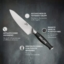 I coltelli perfetti per chef amatoriali, professionisti e tutti coloro che sanno apprezzare lame ben affilate! La serie di coltelliComfort Pro di Zelite Infinity by Klarstein combina estrema affilatura, alta qualità e maneggevolezza con un look di classe, per tagliare, tritare o pelare con la massima facilità. Le lame in acciaio inox tedesco di alta qualità del marchio Thyssenkrupp sono dure, flessibili e affilate come rasoi. Grazie alla transizione priva di giunture e bordi tra lama e guardia e alle impugnature ergonomiche bilanciate possono essere impugnati comodamente e permettono di realizzare tagli di precisione perfetti.