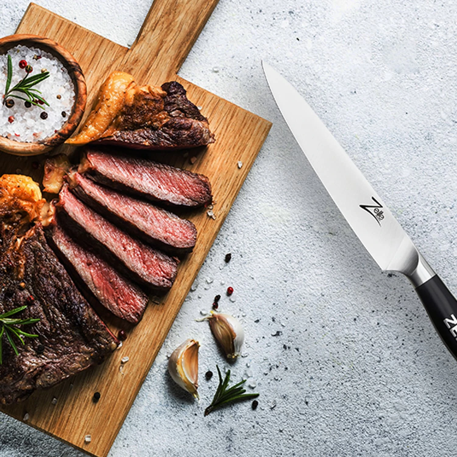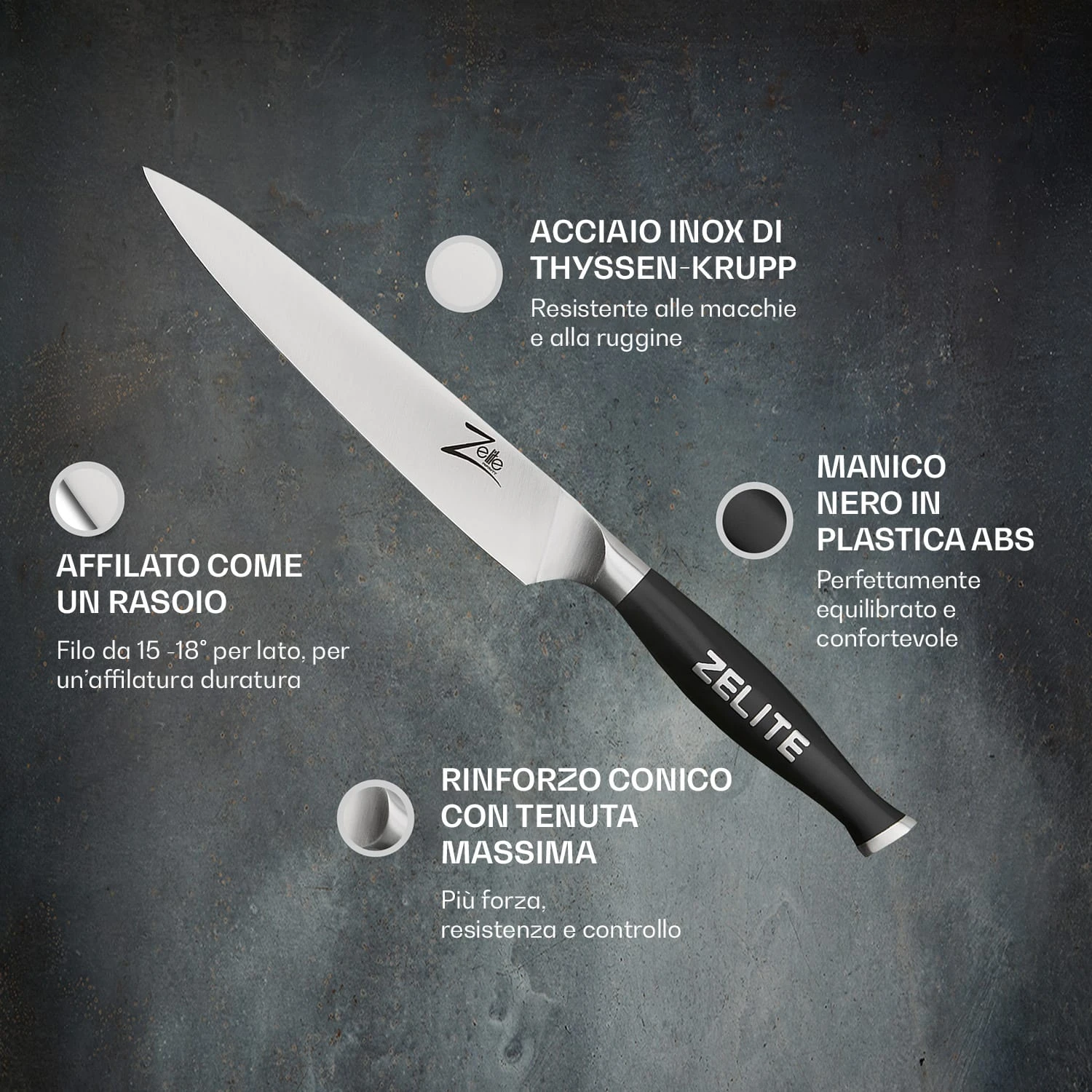 I coltelli perfetti per chef amatoriali, professionisti e tutti coloro che sanno apprezzare lame ben affilate! La serie di coltelliComfort Pro di Zelite Infinity by Klarstein combina estrema affilatura, alta qualità e maneggevolezza con un look di classe, per tagliare, tritare o pelare con la massima facilità. Le lame in acciaio inox tedesco di alta qualità del marchio Thyssenkrupp sono dure, flessibili e affilate come rasoi. Grazie alla transizione priva di giunture e bordi tra lama e guardia e alle impugnature ergonomiche bilanciate possono essere impugnati comodamente e permettono di realizzare tagli di precisione perfetti.