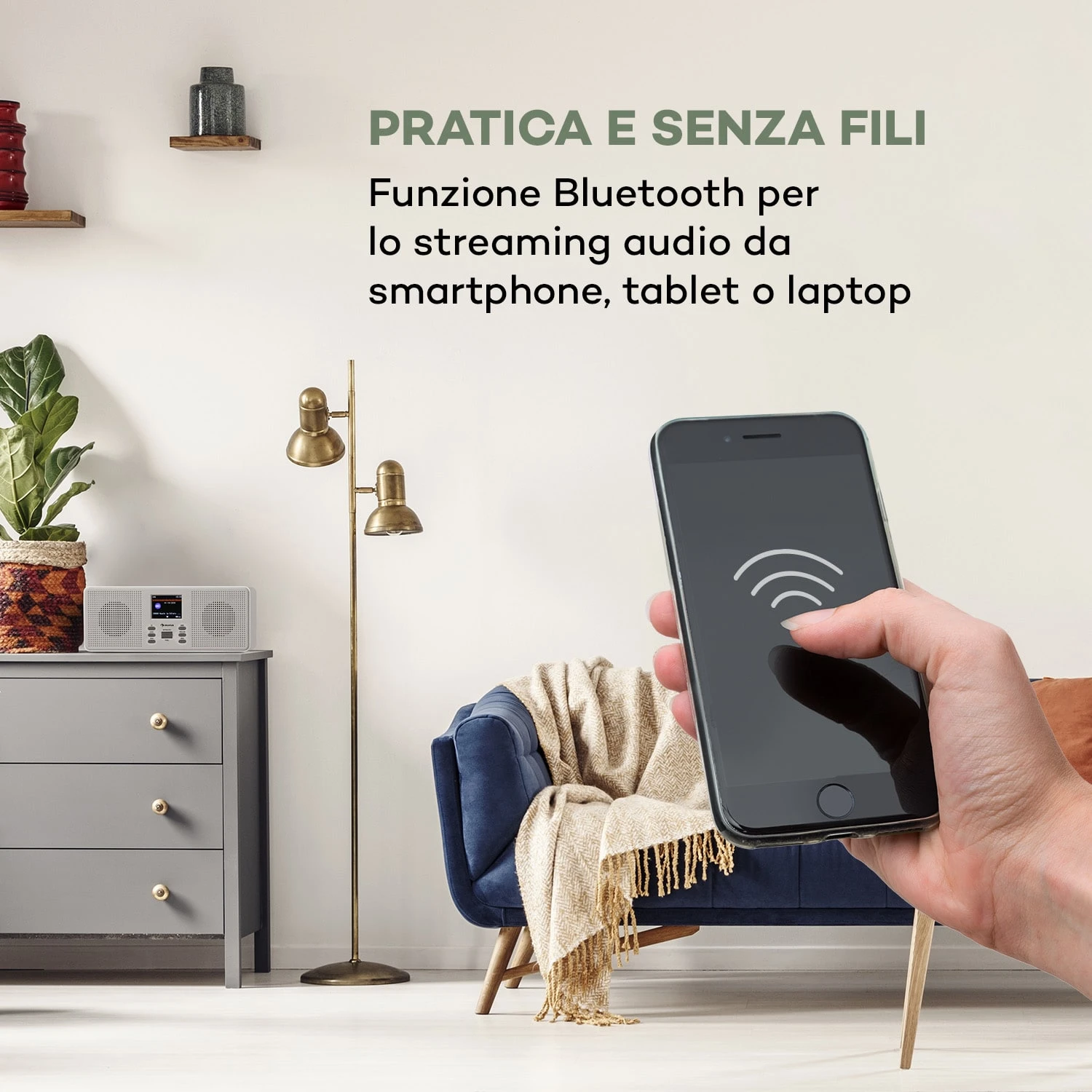 Se non avete voglia di ascoltare la radio, è possibile lo streaming di file audio da smartphone o tablet tramite Bluetooth. Grazie alle casse stereo integrate, la radio digitale Commuter ST di auna assicura un sound bilanciato, senza bisogno di altri impianti aggiuntivi: così avrete sempre il sottofondo ideale, in cucina, soggiorno, giardino o ufficio. Per il sound giusto sono disponibili impostazioni di equalizzazione predefinite, che con le sei opzioni normale/classic/jazz/pop/rock/speech assicurano sempre la selezione corretta. In alternativa, è possibile anche l’impostazione manuale con MyEQ. Doppia sveglia e timer di spegnimento rendono Commuter ST perfetta anche sul vostro comodino.