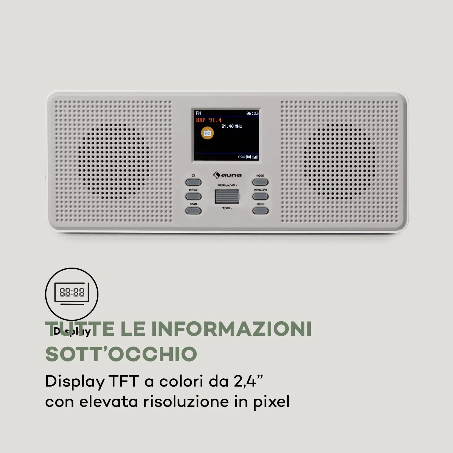 Con la massima flessibilità, Commuter ST di auna riceve emittenti digitali DAB+ e analogiche FM. Una pratica ricerca delle emittenti permette di scansionare l’intera banda di frequenza e di salvare automaticamente i programmi trovati. Le impostazioni del menu necessarie sono gestibili rapidamente grazie al pannello di controllo intuitivo, in modo da potersi dedicare subito all’ascolto. Per tenere sotto controllo tutte le informazioni, come emittente radio, titolo del brano attuale o ora, si trova un chiaro display a colori TFT da 2,4″.