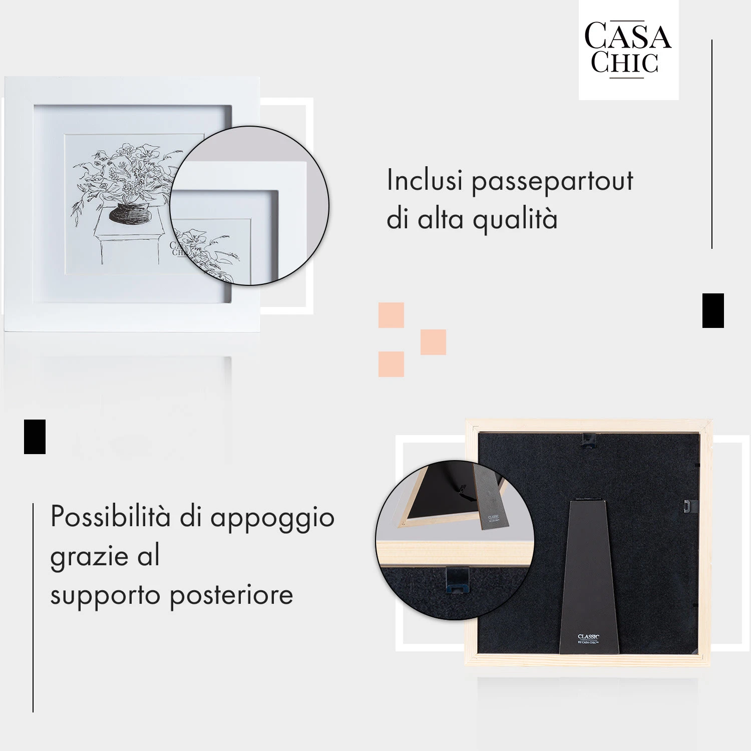 Le cornici Everton di Casa Chic by blumfeldt sono realizzate in legno e valorizzano le tue foto e immagini indipendentemente dal loro posizionamento verticale o orizzontale. Decora le pareti come preferisci, creando dei fantastici collage oppure disponi le tue foto più amate sul comodino o su uno scaffale. Il passepartout incluso ti permetterà di scegliere il formato ideale per la tua foto. La semplicità del profilo della cornice e la lastra frontale in vero vetro offrono eleganza e il massimo della protezione.