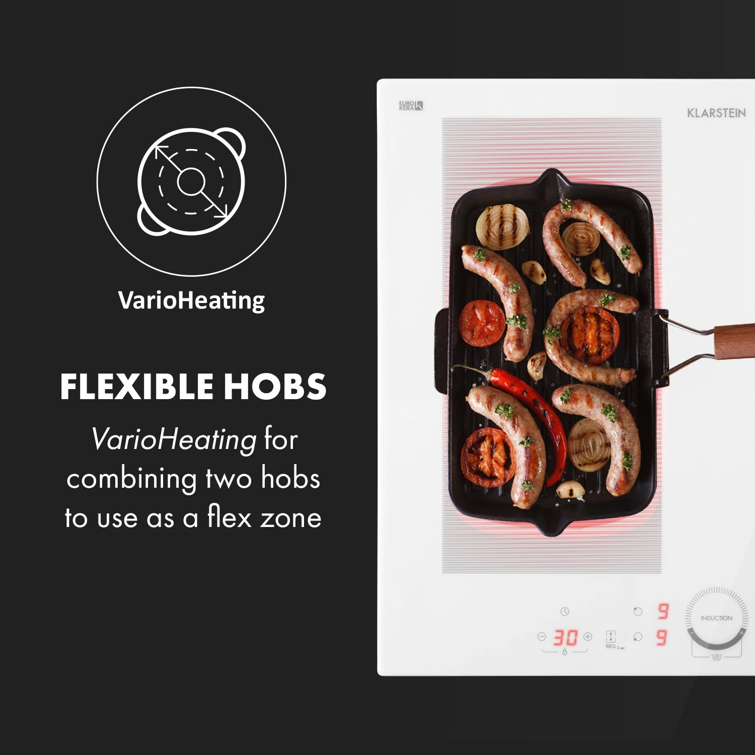 Il piano cottura a incasso Delicatessa 60 Hybrid di Klarstein offre 4 superfici totali, 2 x 2000 e 2 x 1500 Watt, per una potenza complessiva di 7000 Watt, capaci di far cuocere il contenuto di pentole e padelle in tempi da record. Entrambe le zone a sinistra possono unirsi in una zona flessibile: si adattano alle dimensioni di pentole, padelle o casseruole grazie al rilevamento della pentola e riscaldano anche stoviglie che sarebbero troppo grandi per una singola zona. Delicatessa 60 Hybrid consuma in questo modo solo l’energia effettivamente necessaria e permette l’utilizzo di stoviglie di ogni dimensione. Tutte le zone possono essere regolate separatamente e sono dotate di funzione ThermoBoost, con cui la potenza viene incrementata fino a 2800 W per scaldare in un lampo. Il controllo del piano cottura in vetroceramica Delicatessa 60 Hybrid di Klarstein avviene facilmente con il pannello di controllo integrato SenseControl con regolazioni Touch-to-slide per la potenza e display digitale. In questo modo, non ci sono bottoni o manopole a interrompere la superficie della vostra cucina. Oltre alla potenza di ogni fornello, è possibile impostare un timer fino a 99 minuti, che una volta scaduto spegne automaticamente il piano cottura o emette un segnale acustico.