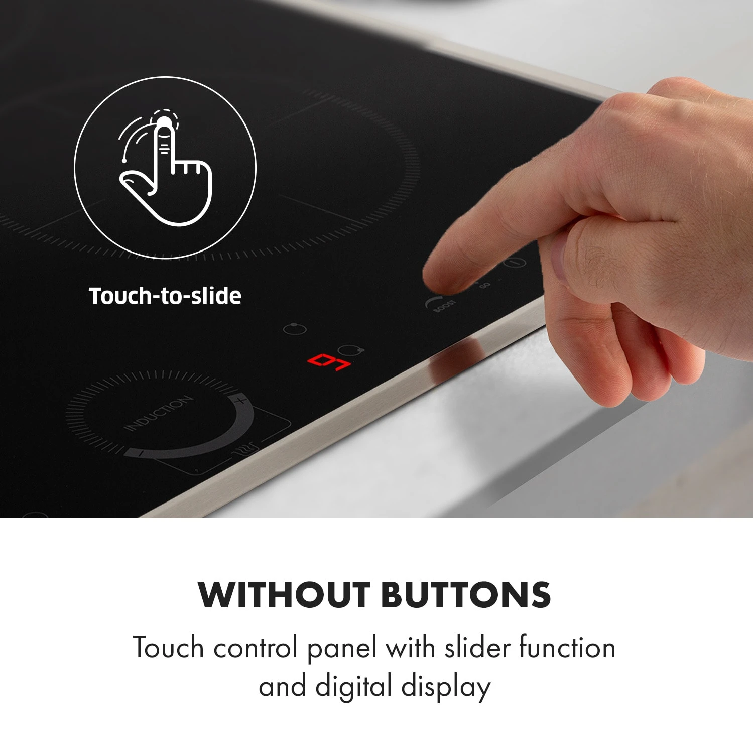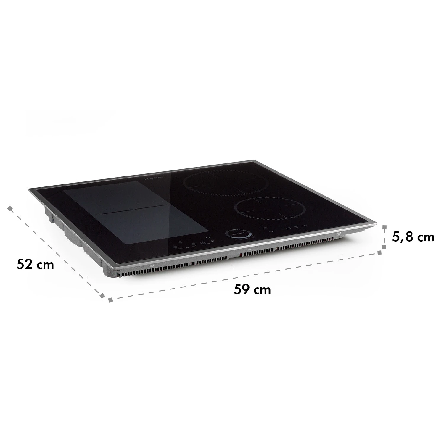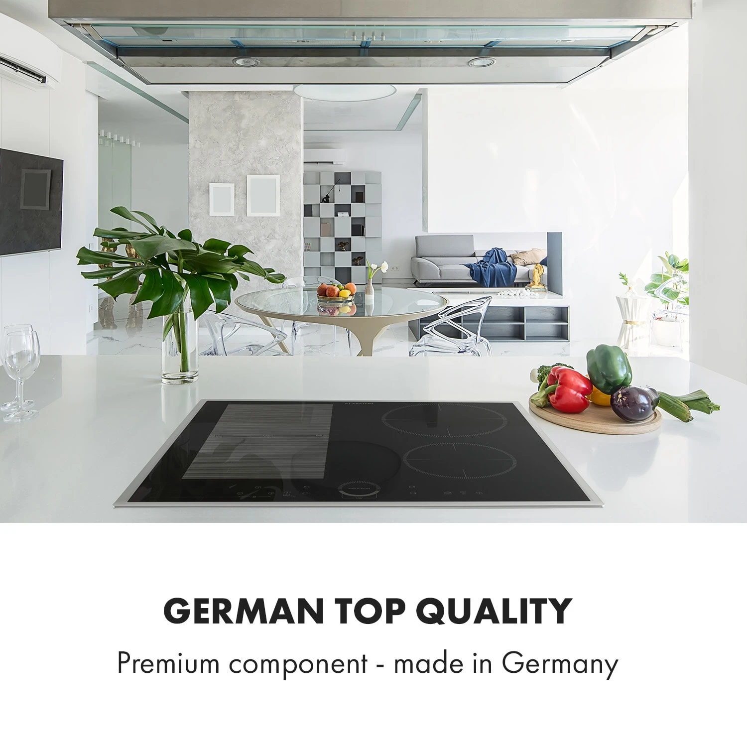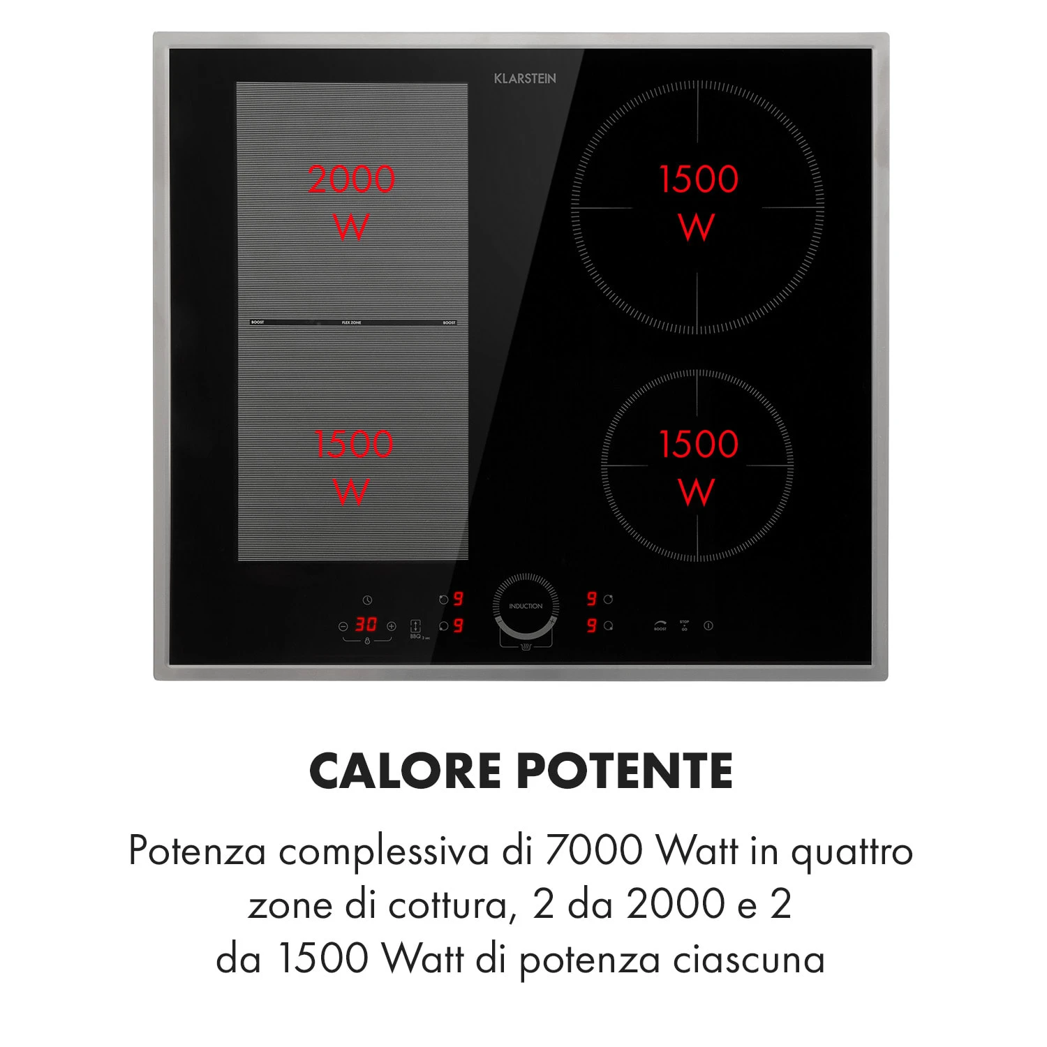 Il piano cottura a incasso Delicatessa 60 Hybrid Prime di Klarstein offre 4 superfici totali, 2 x 2000 e 2 x 1500 Watt, per una potenza complessiva di 7000 Watt, capaci di far cuocere il contenuto di pentole e padelle in tempi da record. Entrambe le zone a sinistra possono unirsi in una zona flessibile: si adattano alle dimensioni di pentole, padelle o casseruole grazie al rilevamento della pentola e riscaldano anche stoviglie che sarebbero troppo grandi per una singola zona. Delicatessa 60 Hybrid Prime consuma in questo modo solo l’energia effettivamente necessaria e permette l’utilizzo di stoviglie di ogni dimensione. Tutte le zone possono essere regolate separatamente e sono dotate di funzione ThermoBoost, con cui la potenza viene incrementata fino a 2800 W per scaldare in un lampo. Il controllo del piano cottura in vetroceramica Delicatessa 60 Hybrid Prime di Klarstein avviene facilmente con il pannello di controllo integrato SenseControl con regolazioni Touch-to-slide per la potenza e display digitale. In questo modo, non ci sono bottoni o manopole a interrompere la superficie della vostra cucina. Oltre alla potenza di ogni fornello, è possibile impostare un timer fino a 99 minuti, che una volta scaduto spegne automaticamente il piano cottura o emette un segnale acustico.