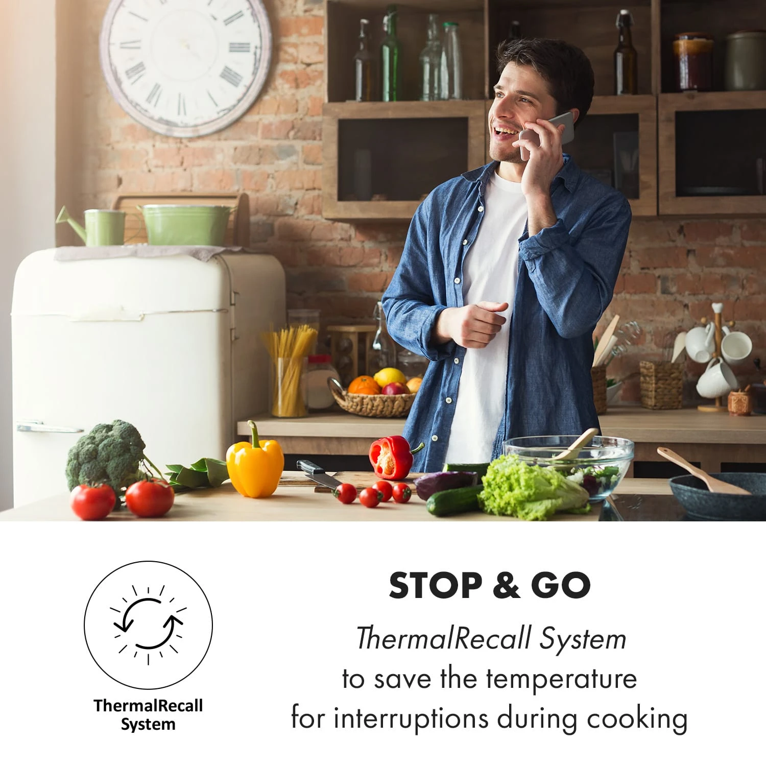Per cucinare senza pensieri, il piano cottura a incasso Delicatessa 60 Hybrid Prime di Klarstein è dotato di diversi sistemi di sicurezza: una protezione da surriscaldamento con spegnimento automatico si attiva se uno dei fornelli diventa troppo caldo. Un’indicazione di calore residuo con principio EcoThermal-Control non solo vi indica quali fornelli sono ancora caldi, ma permette di sfruttare il calore residuo per cucinare risparmiando energia. La funzione ThermalRecall si ricorda la temperatura impostata ed è utile quando è necessario interrompere brevemente la sessione ai fornelli per poi riprenderla in seguito. Inoltre, è possibile attivare una sicura per i bambini, che impedisce una modifica involontaria delle impostazioni.