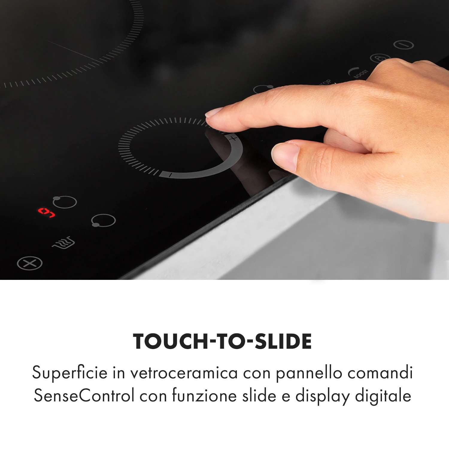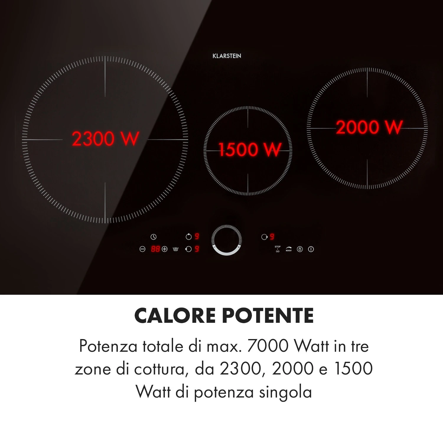 Il piano cottura a induzione Delicatessa 80 di Klarstein offre tre superfici da 2300, 2000 e 1500 Watt, per una potenza complessiva di 7400 Watt, capaci far cuocere il contenuto di pentole e padelle in tempi da record. La zona sinistra, con un diametro di 30 cm, risulta particolarmente grande, ideale per padelle e pentole di grandi dimensioni. Tutte le zone possono essere regolate separatamente e sono dotate di funzione ThermoBoost, con cui la potenza viene incrementata fino a 3000 W per scaldare in un lampo. Il controllo del piano cottura in vetroceramica Delicatessa 80 di Klarstein avviene facilmente con il pannello di controllo integrato SenseControl con regolazioni Touch-to-slide per controllare la potenza e display digitale. In questo modo non ci saranno bottoni o manopole a interrompere la superficie della vostra cucina. Oltre alla potenza di ogni fornello, è possibile impostare un timer fino a 99 minuti, che una volta scaduto spegne automaticamente il piano cottura o emette un segnale acustico.
