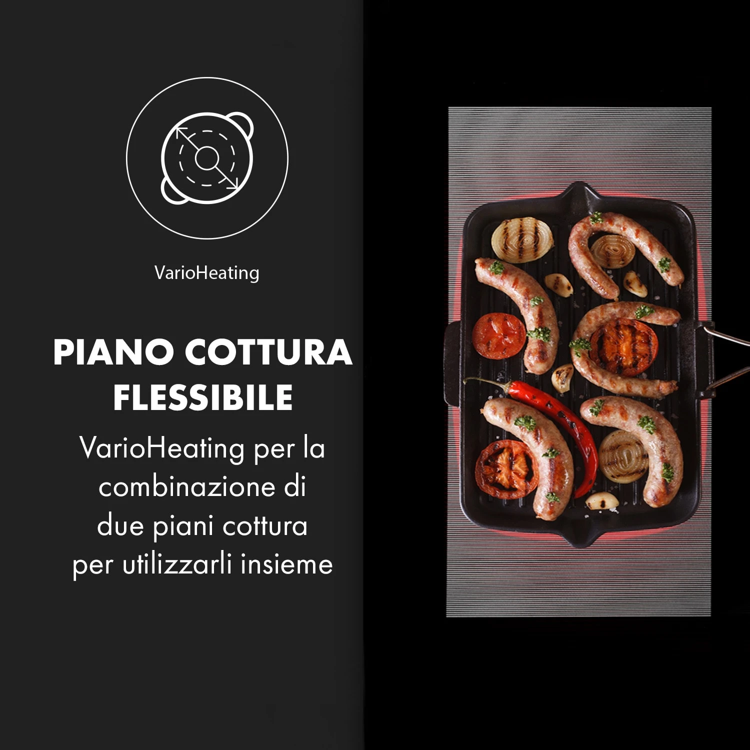 Cucinare con maggiore flessibilità: il piano cottura a induzione Delicatessa 90 Flex di Klarstein permette uno sfruttamento ottimale dello spazio con consumi energetici minimi. Il dispositivo unisce innovazione tecnologica e aspetto elegante, portando nuovo splendore in cucina con la sua superficie in vetroceramica.