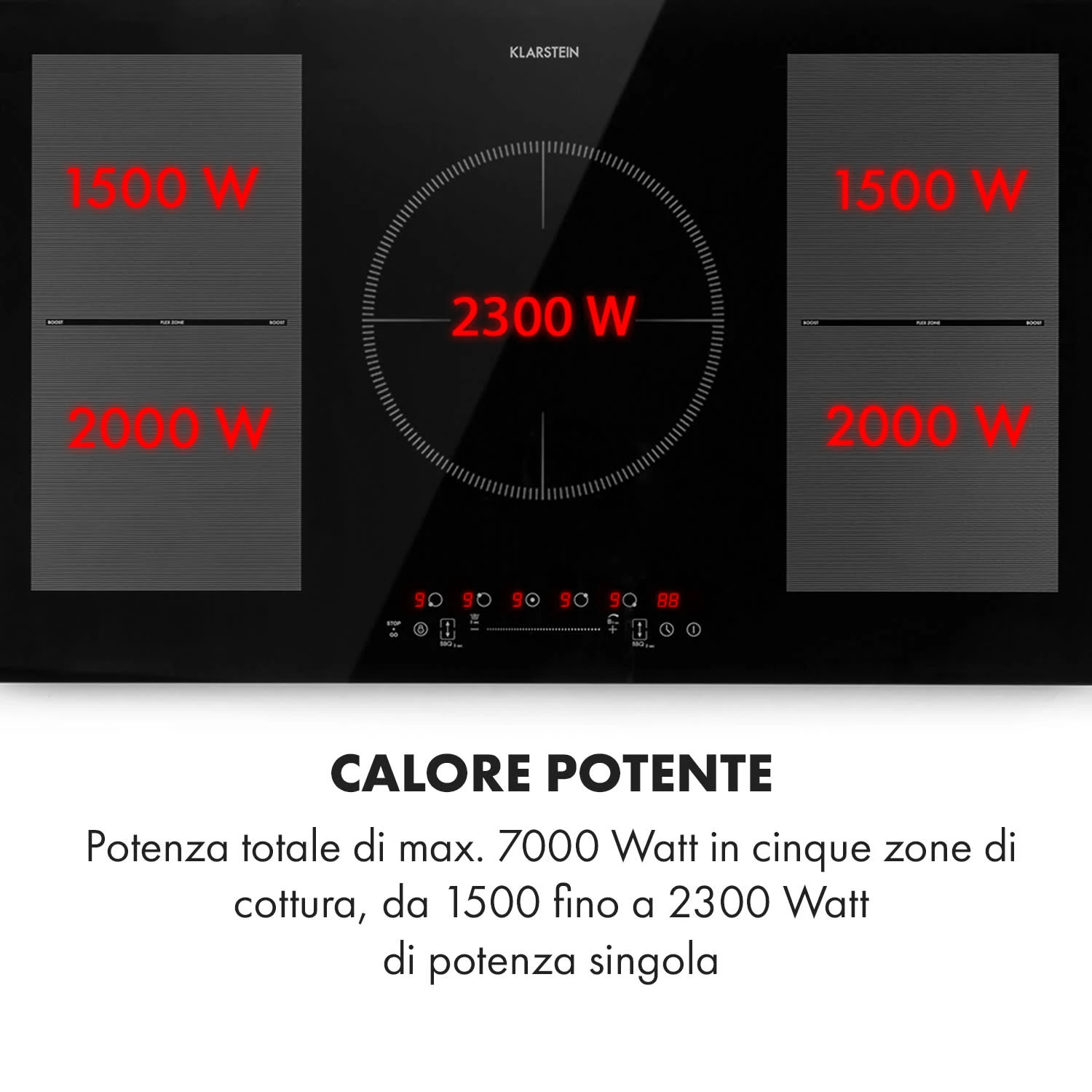 Il piano cottura a induzione Delicatessa 90 Flex di Klarstein offre 5 superfici totali, 1 x 2300, 2 x 2000 e 2 x 1500 Watt, per una potenza complessiva di 7400 Watt, capaci di far cuocere il contenuto di pentole e padelle in tempi da record. Entrambe le zone a sinistra e destra possono unirsi in una zona flessibile con VarioHeating: con la massima flessibilità si adattano alle dimensioni di pentole, padelle o casseruole grazie al rilevamento della pentola e riscaldano anche stoviglie che sarebbero troppo grandi per una singola zona. Delicatessa 90 Flex consuma in questo modo solo l’energia effettivamente necessaria e permette l’utilizzo di stoviglie di ogni dimensione. Tutte le zone singole e la zona flex possono essere regolate separatamente e sono dotate di funzione ThermoBoost, con cui la potenza viene incrementata fino a 3000 W per scaldare in un lampo. Il controllo del piano cottura in vetroceramica Delicatessa 90 Flex di Klarstein avviene facilmente con il pannello di controllo integrato SenseControl con regolazioni Touch-to-slide per la potenza e display digitale. In questo modo non ci sono bottoni o manopole a interrompere la superficie della vostra cucina. Oltre alla potenza di ogni fornello, è possibile impostare un timer fino a 99 minuti, che una volta scaduto spegne automaticamente il piano cottura o emette un segnale acustico.