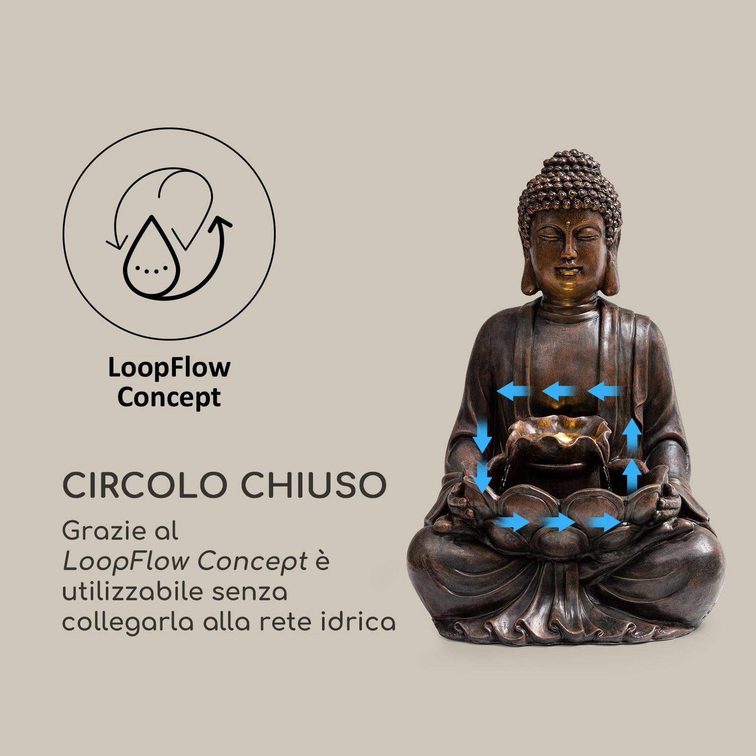 La fontana solare Dharma è, grazie alle sue dimensioni 48 x 72 x 41 cm (LxAxP), piacevolmente compatta e riempie spazi abitativi e giardini con un’atmosfera armonica. Grazie alla SunRiver Technology il funzionamento solare senza elettricità alleggerisce i costi energetici e facilita la ricerca di un posto adeguato per l’installazione. L’illuminazione soffusa conferisce alla figura una lucentezza particolare, trasformandola anche nelle ore serali e notturne in un luogo di rifugio estetico. Nell’appartamento la fontana ornamentale ha un effetto rilassante e positivo sulla salute: umidifica automaticamente l’aria, migliora la temperatura ambiente e consente di respirare a pieni polmoni. La pompa della fontana con LoopFlow Concept mantiene operativo il circuito chiuso dell’acqua in modo silenzioso anche in funzionamento continuo. La fontana da giardino in poliresina resistente è protetta al meglio dal vento e dalle intemperie. Così la si può ammirare e lasciare all’aperto tutto l’anno.