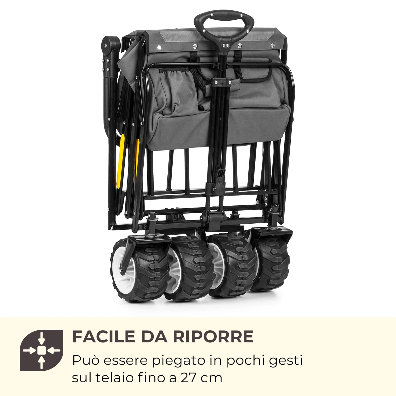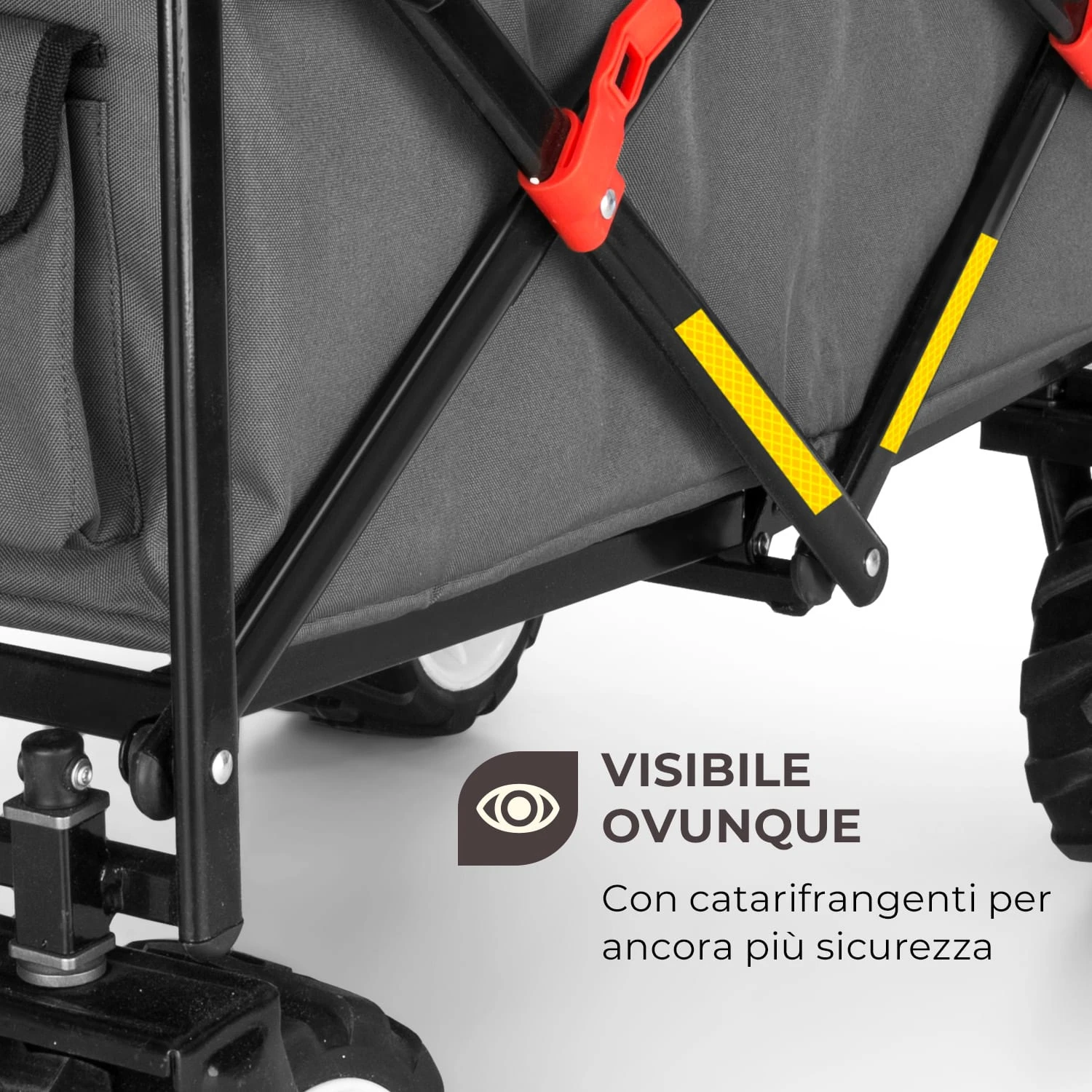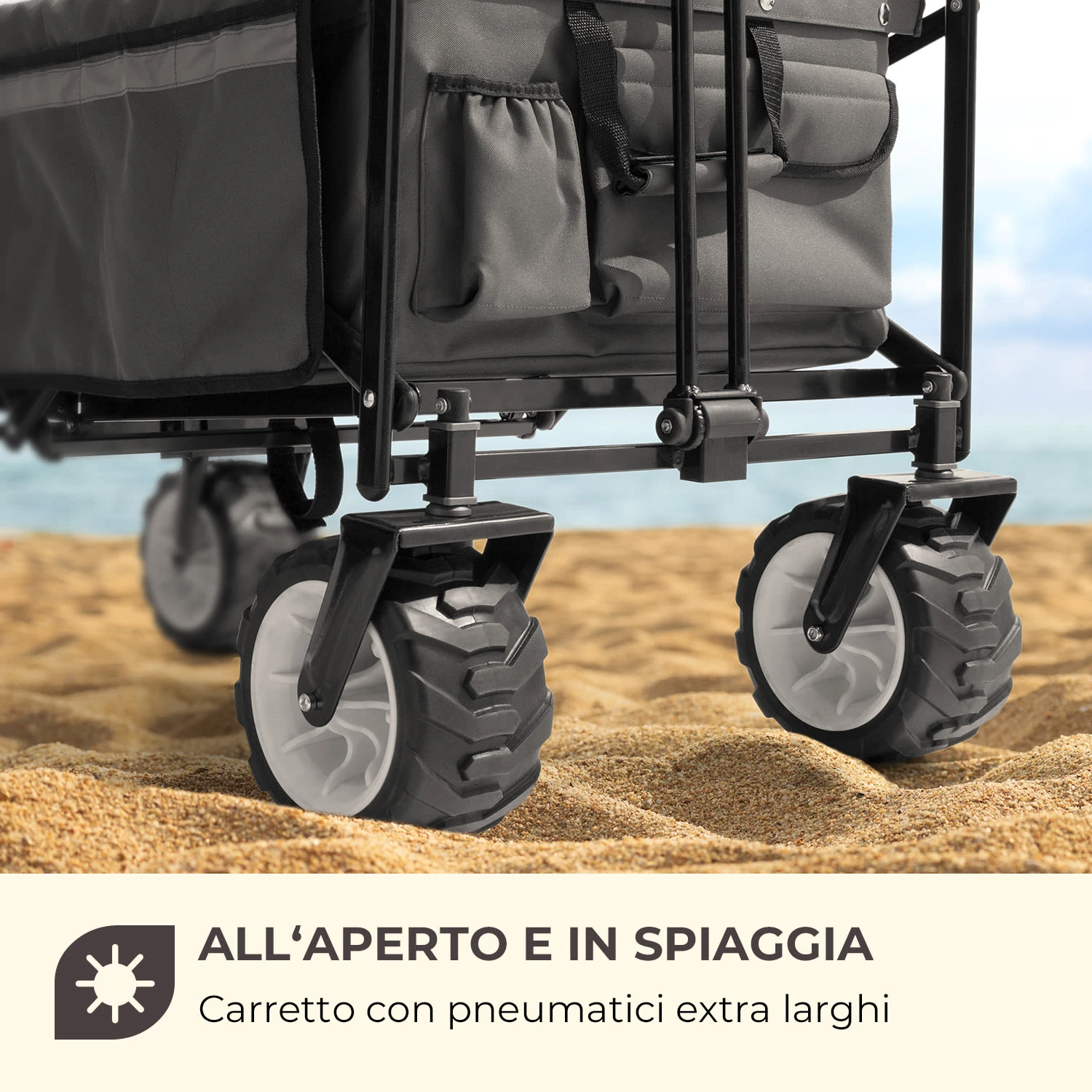 Le tasche sui lati esterni del carretto a mano sono ideali per contenere piccoli oggetti come utensili per la spiaggia o giocattoli. Le ruote di plastica molto larghe di 10 cm si adattano a qualsiasi suolo e mantengono senza problemi la necessaria stabilità. In tal modo anche il tragitto su dune sabbiose diventerà un gioco da ragazzi. Dopo l’utilizzo la struttura pieghevole del telaio realizzata in stabili tubi d’acciaio può essere piegata velocemente e conservata senza ingombrare.