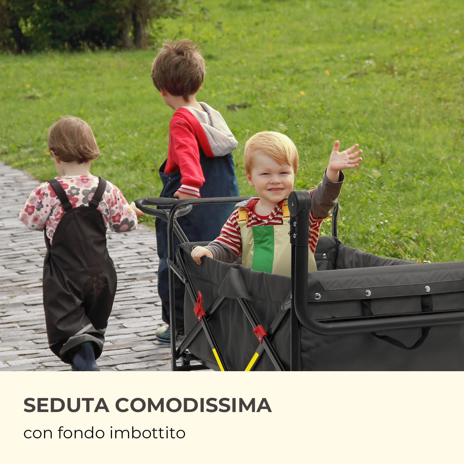 Con l’aiuto del braccio telescopico allungabile davanti e dell’asta per spingere dietro, il carretto a mano si può tirare o spingere in modo molto semplice. Le ruote con movimento libero sono provviste di cuscinetti a sfera che garantiscono una guida leggera e morbida. Le due cinture di sicurezza all’interno e i riflettori all’esterno garantiscono una maggiore sicurezza, molto importante nel caso in cui vengano trasportati bambini. Il suolo imbottito consente un elevato comfort di sicurezza per tutti i bambini.