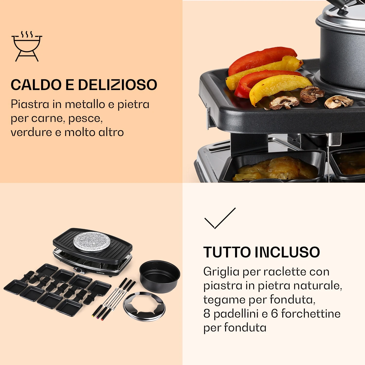 Coppia fissa: il grill per raclette Entrecote di Klarstein pone nuovi standard per chi ama banchettare in compagnia, combinando sapientemente raclette e fonduta. Chi ama invitare amici e parenti a casa per gustare deliziose pietanze, senza dover però faticare per ore nella preparazione, sicuramente apprezza la comodità e il piacere di accomodarsi attorno al tavolo con una fonduta di carne o formaggio o con una squisita raclette. La griglia da tavolo Entrecote offre l’equipaggiamento ideale per una grande varietà culinaria tra le mura di casa per ben 8 persone.