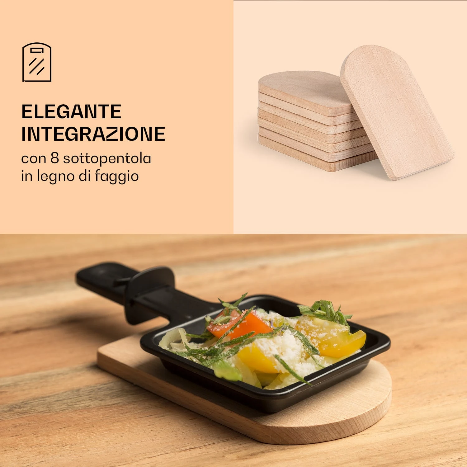 Non ci sono limiti alla creatività: le padelline per la raclette possono essere riempite liberamente in base al gusto di ogni singolo ospite e messe poi a gratinare nel grill per raclette. Mentre formaggio, verdure, carne e pesce sfrigolano comodamente, potete tranquillamente continuare a chiacchierare intorno al tavolo, avvolti dal delizioso profumo delle leccornie che vi aspettano. Sopra alle otto padelline, sulla piastra potete grigliare pane, carne, pesce e verdure per accompagnare le vostre creazioni. Sulla robusta piastra in pietra naturale è possibile cuocere delicatamente e con pochi grassi. Ovviamente, non è possibile preparare solo squisitezze salate, ma anche fantastici dessert, come banane o fette di ananas caramellate al miele. Grazie al rivestimento antiaderente, le pietanze possono essere tolte senza alcun problema dalle padelline e dalla piastra. Per sapere sempre dove poggiare le vostre padelline bollenti, nel set sono inclusi 8 appositi appoggi in legno di faggio.