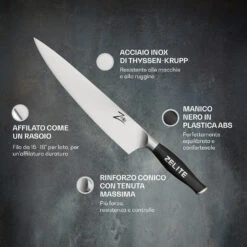 Il nostro coltello da cuoco Celebrity Executive-Plus Serie di Zelite Infinity by Klarstein può essere descritto al meglio come sottile, resistente e di gran classe. La sua lama raffinata e resistente presenta una larghezza di ben 56 mm. Abbiamo anche aggiunto una superficie martellata Tsuchime per ridurre al minimo l’aderenza degli alimenti alla lama. L’impugnatura ergonomica G-10 presenta una struttura curva esattamente nei punti ideali, in modo che il coltello sembri fatto su misura per la tua mano. Questo attrezzo elegante ed efficiente risveglierà senza dubbio la tua passione per la cucina di alto livello.