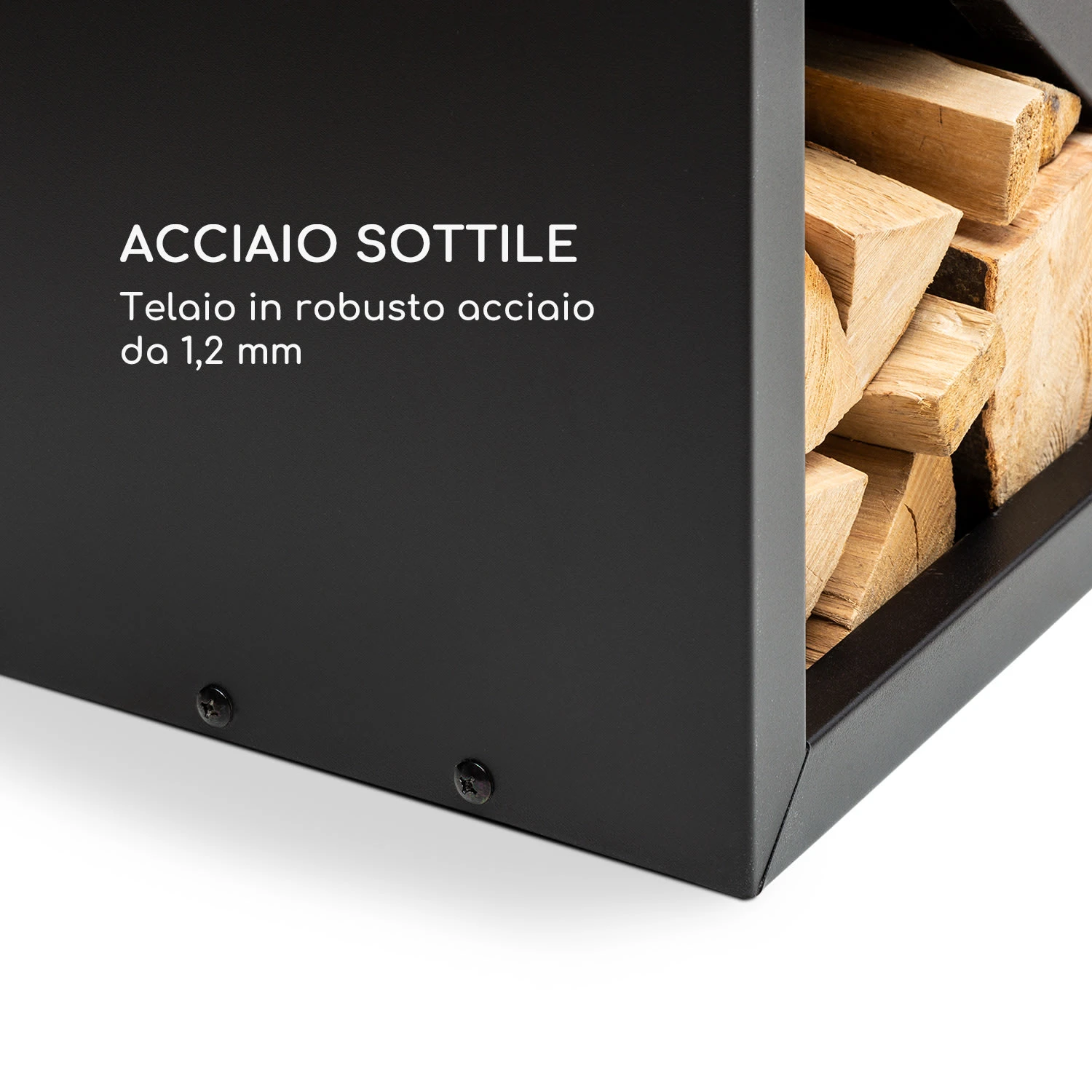 Chi non si siede volentieri davanti a un fuoco scoppiettante e che riscalda? Con la Firebowl Kindlewood L Black di Blumfeldt ti puoi comodamente rilassare: i tronchetti di legno sono subito a portata di mano per alimentare il fuoco, perché ci sei seduto sopra, nel vero senso della parola. La legnaia consente di avere non solo un luogo di stoccaggio moderno e salvaspazio, ma è anche allo stesso tempo una comoda panca. Inoltre colpisce con il suo magnifico design puristico in acciaio e bambù. La sua visione lussuosa si completa solo quando accatasti i tronchetti di legno all’interno della panca, perché il legno armonizza perfettamente con i materiali. Le pareti divisorie diagonali superano l’aspetto esclusivo e ti aiutano ad accatastare la legna da ardere. Inoltre fanno in modo che la pila di legno non crolli quando estrai un tronchetto.