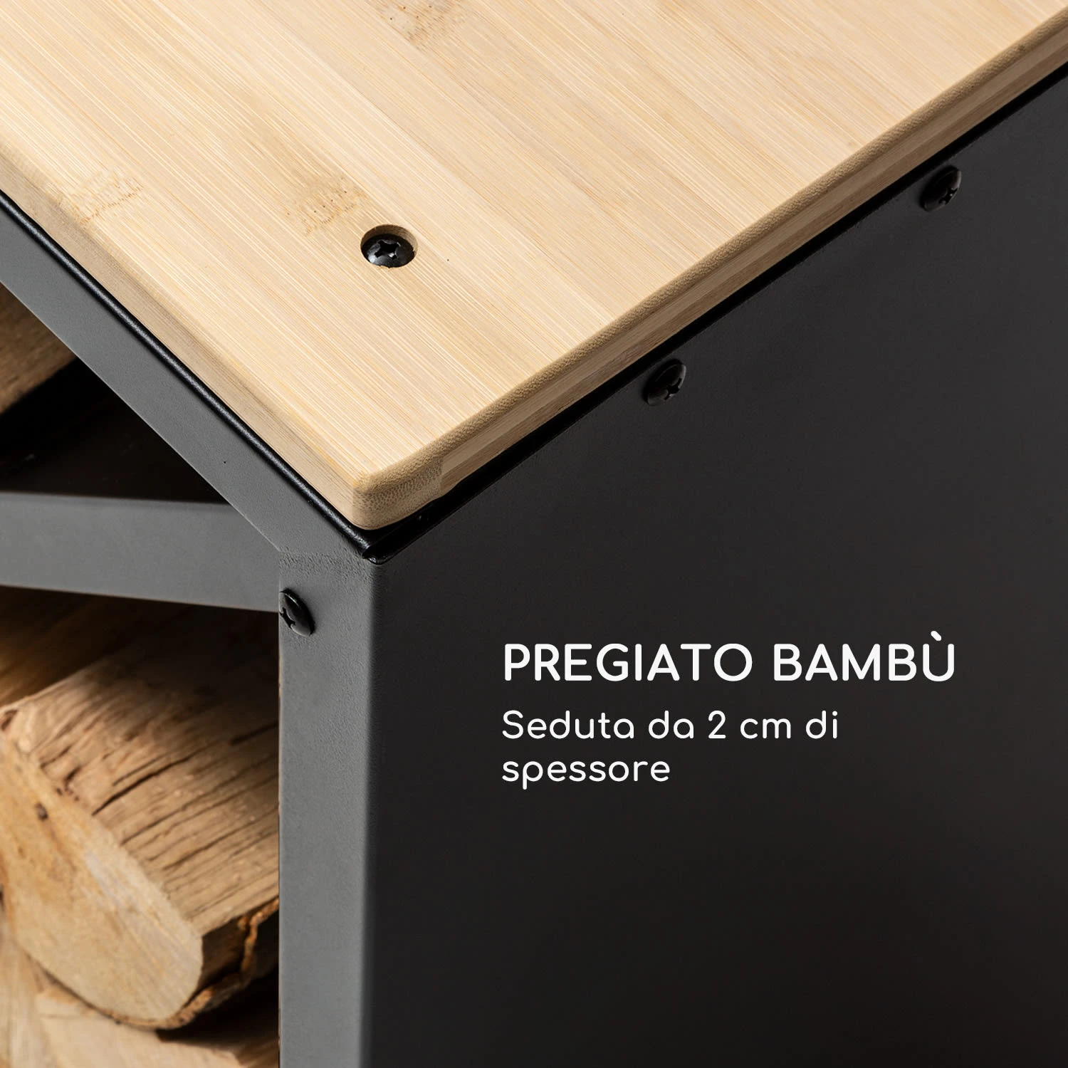 Chi non si siede volentieri davanti a un fuoco scoppiettante e che riscalda? Con la Firebowl Kindlewood S Black di Blumfeldt ti puoi comodamente rilassare: i tronchetti di legno sono subito a portata di mano per alimentare il fuoco, perché ci sei seduto sopra, nel vero senso della parola. La legnaia consente di avere non solo un luogo di stoccaggio moderno e salvaspazio, ma è anche allo stesso tempo una comoda panca. Inoltre colpisce con il suo magnifico design puristico in acciaio e bambù. La sua visione lussuosa si completa solo quando accatasti i tronchetti di legno all’interno della panca, perché il legno armonizza perfettamente con i materiali. La parete divisoria diagonale supera l’aspetto esclusivo e ti aiuta ad accatastare la legna da ardere. Inoltre fa in modo che la pila di legno non crolli quando estrai un tronchetto.
