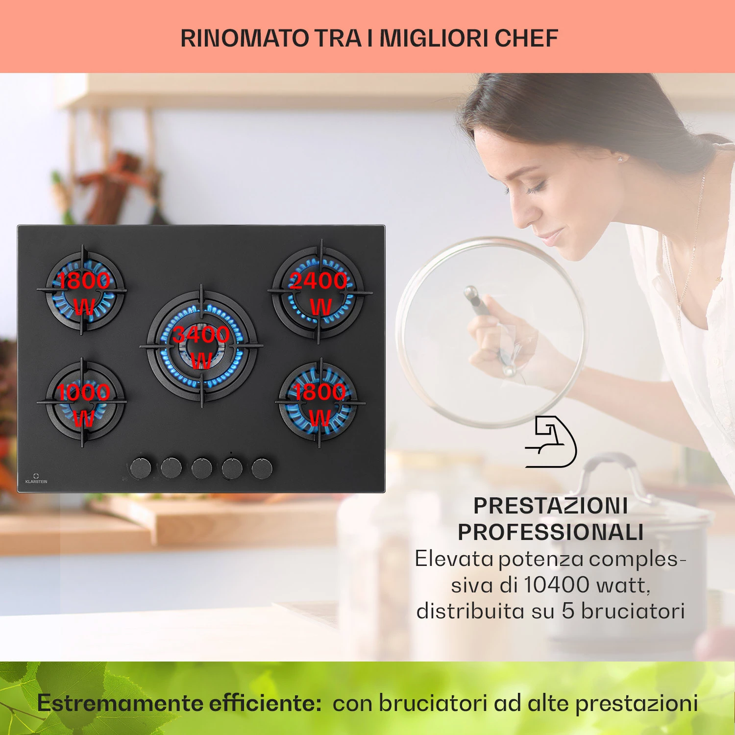 Chi ama cucinare, preferisce un piano cottura a gas. Il gas non solo è più efficiente ed ecologico, ma assicura anche un maggiore controllo e risulta più pratico per cucinare rispetto all’elettricità. Con il piano cottura a gas Firetale di Klarstein, da oggi è possibile in ogni cucina, con la massima semplicità.