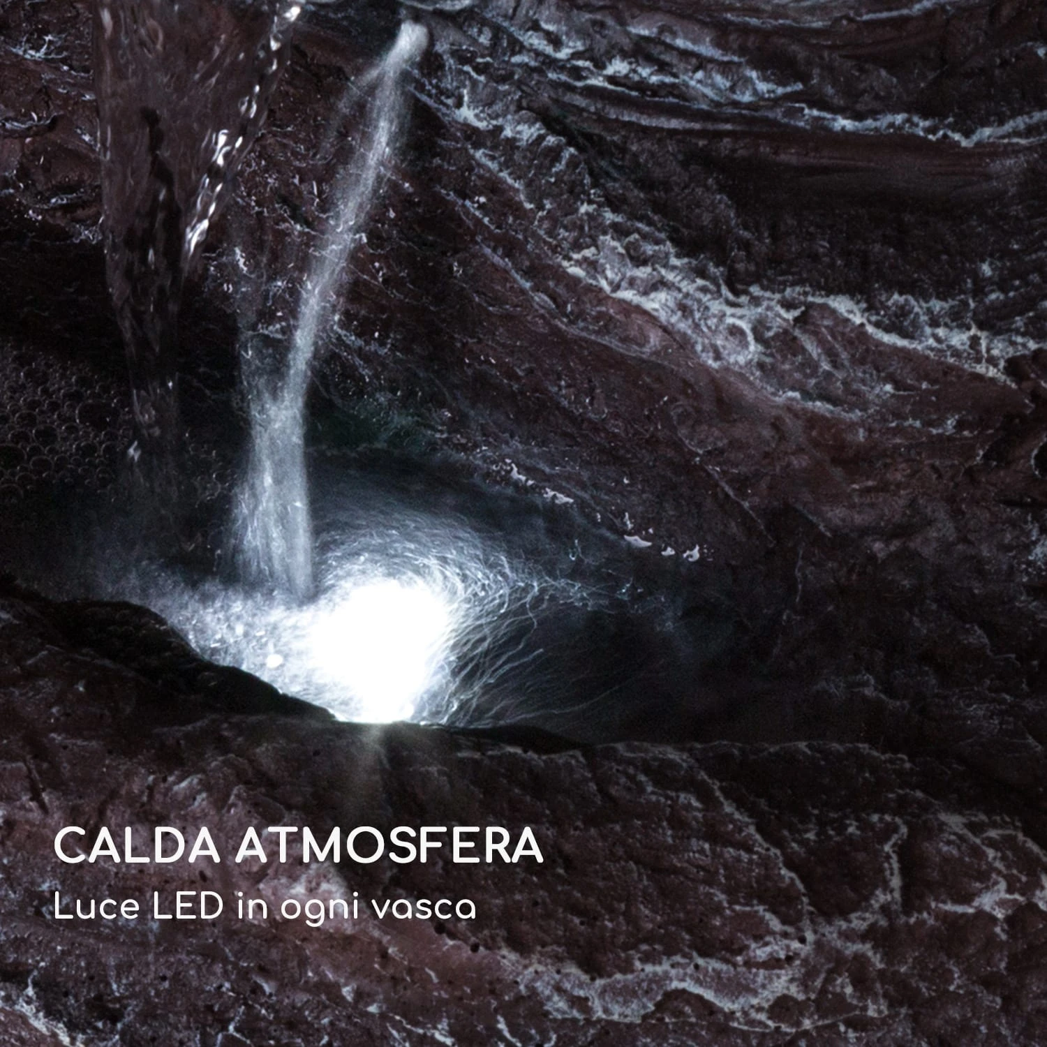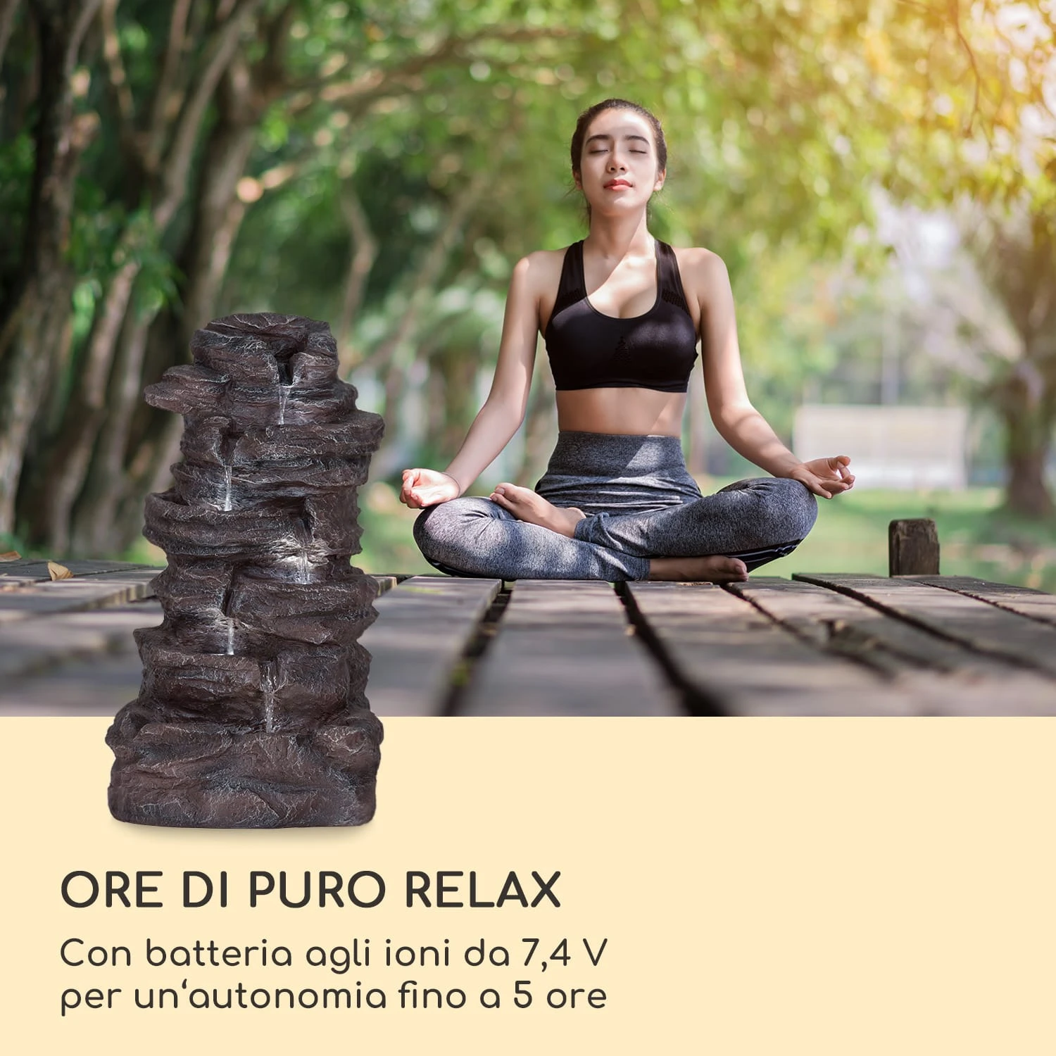 Il design arrotondato con un raffinato effetto pietra rende la fontana solare Stonehenge XL blumfeldt un bellissimo accessorio per la casa e conferisce a qualsiasi luogo un’atmosfera rilassante. Osservate lo scintillante gioco di luci attraverso l’illuminazione subacquea a LED e lasciatevi sedurre dal dolce sciabordio. Qui il puro relax è all’ordine del giorno, e la fontana offre anche un clima piacevolmente fresco e salutare. Nel circuito chiuso dell’acqua, l’acqua fredda scorre da uno livello all’altro in un ciclo continuo. Ciò significa che non è necessario il collegamento a una fonte d’acqua esterna.