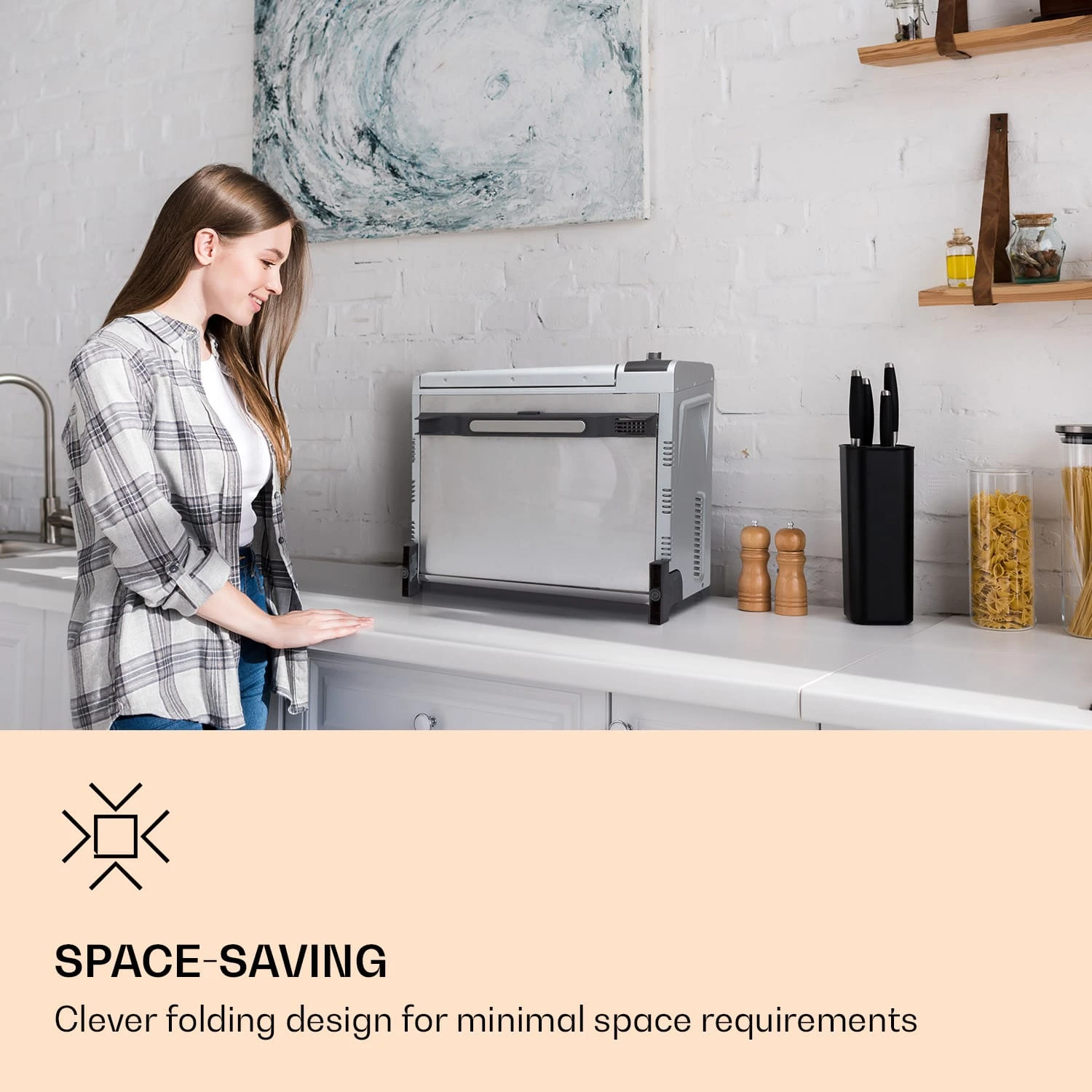 La friggitrice ad aria calda Vita-Crisp di Klarstein è uno snello tuttofare in cucina. È possibile impostare comodamente le sue 8 diverse funzioni – friggere, cuocere, grigliare, disidratare, tostare, infornare, tenere in caldo e modalità pizza – tramite il display frontale con manopola. Il set di accessori da quattro pezzi fornisce tutto il necessario per preparare spuntini caldi e croccanti. Grazie all’interno spazioso, Vita-Crisp può gestire facilmente pizze da 33 cm. La pulizia è facilissima grazie al design intelligente: il fondo può essere completamente aperto.